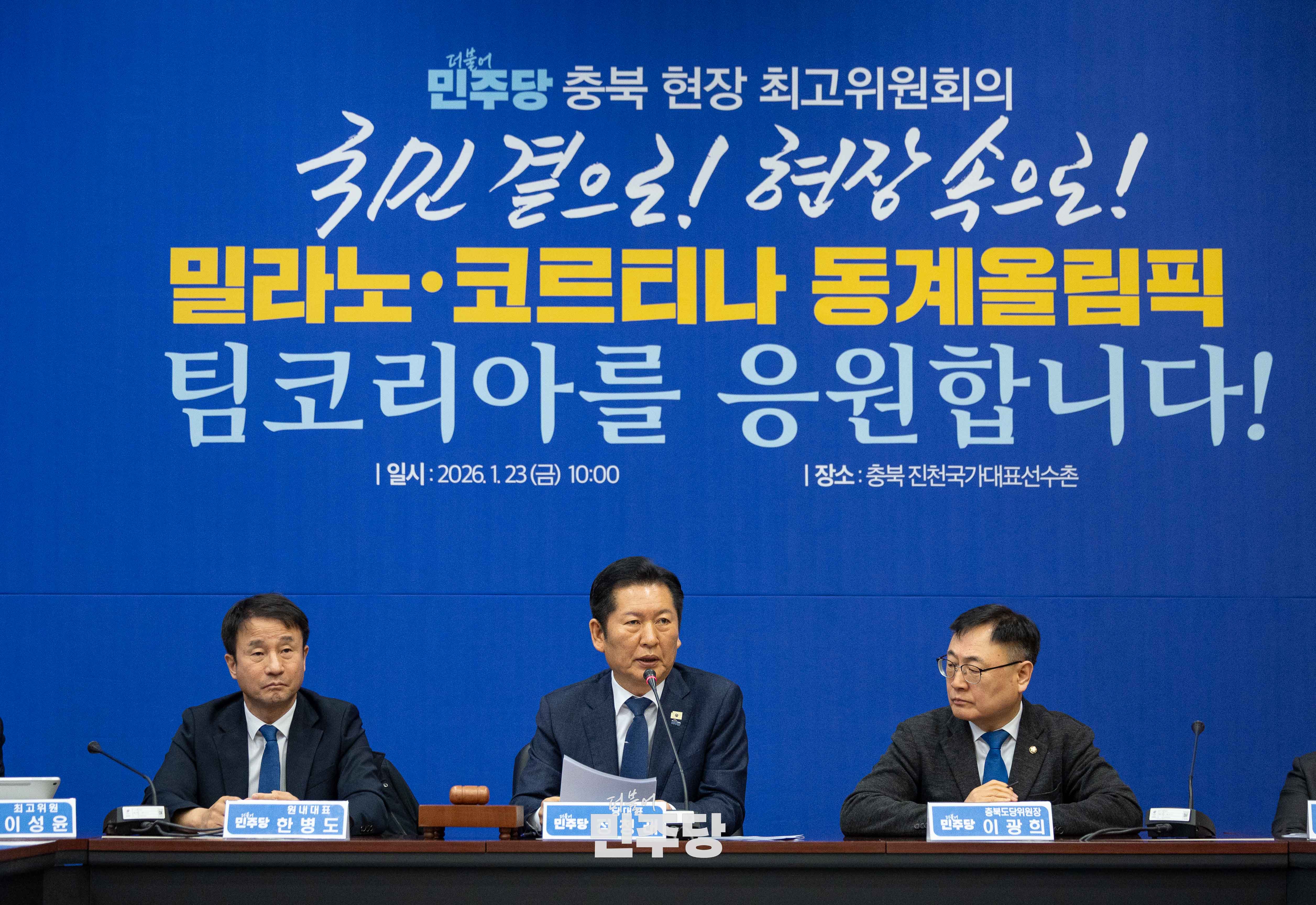 정청래 당대표가 2026.01.24.(금) 충북 진천에 위치한 진천선수촌에서 열린 충북 현장최고위원회의에 참석하여 모두발언을 하고 있다.