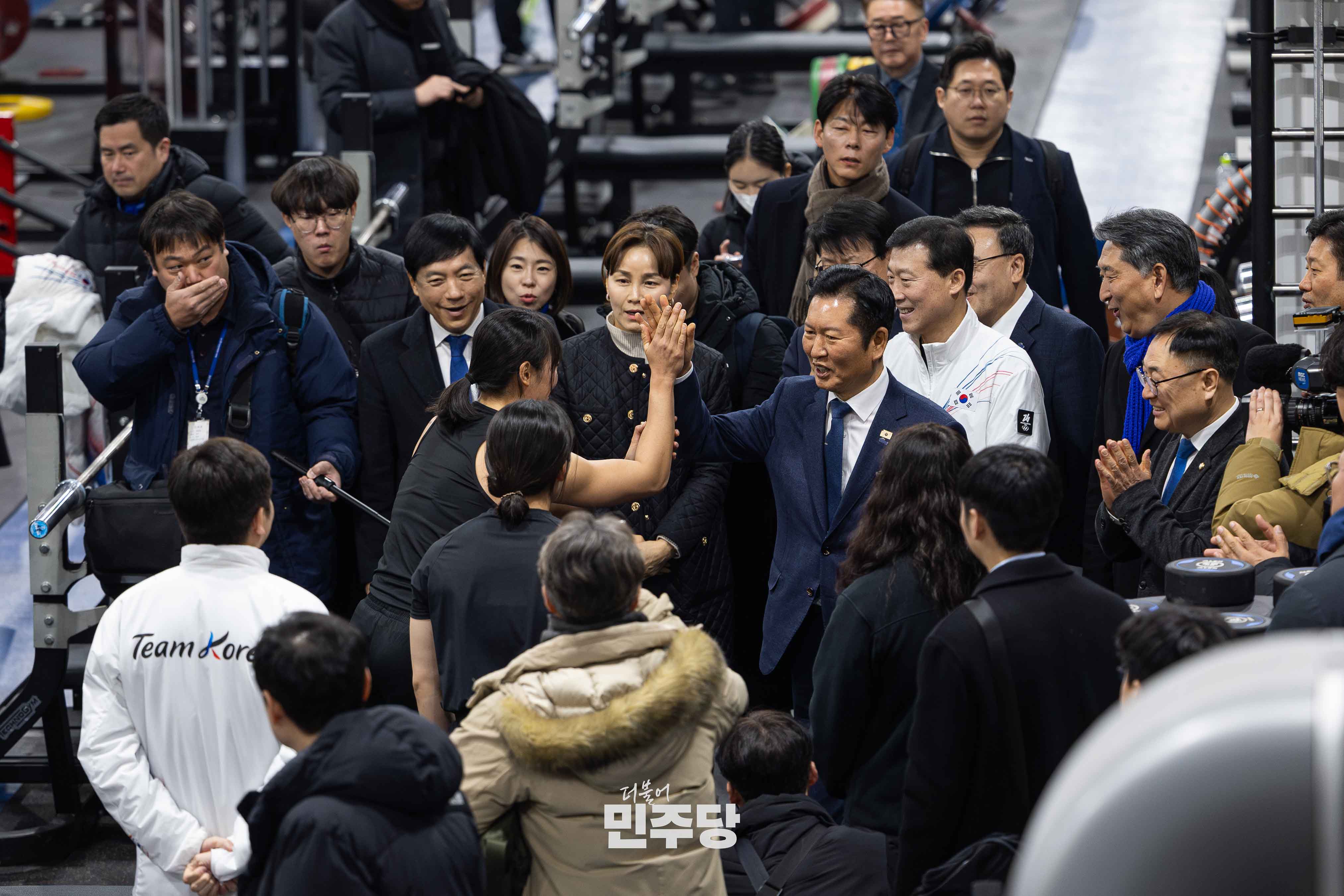 정청래 당대표가 2026.01.24.(금) 충북 진천에 위치한 진천선수촌에 방문하여 트레이닝 중인 국가대표 선수와 손벽인사를 나누고 있다.