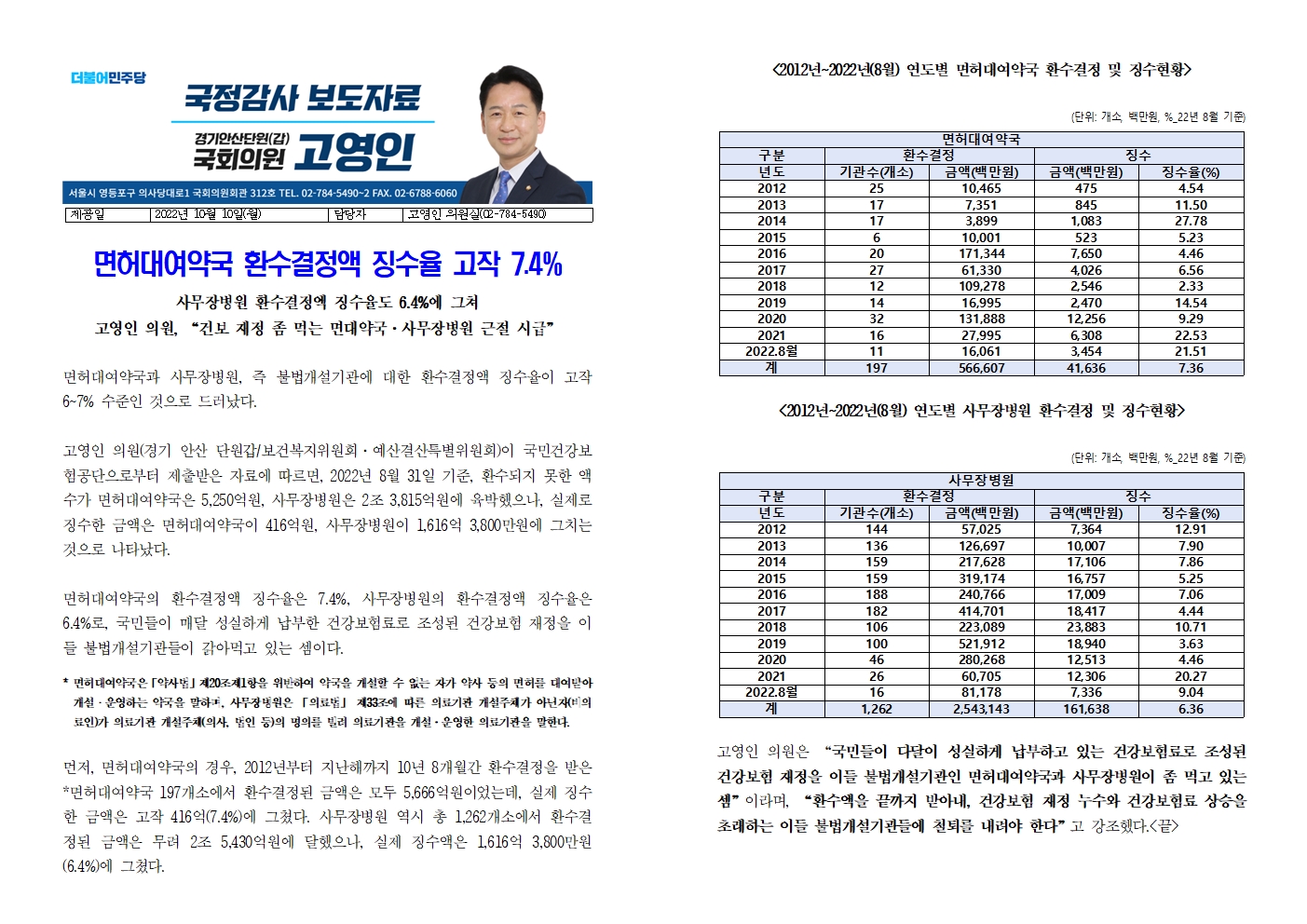 [국회의원 고영인] 면허대여약국 환수결정액 징수율 고작 7.4%