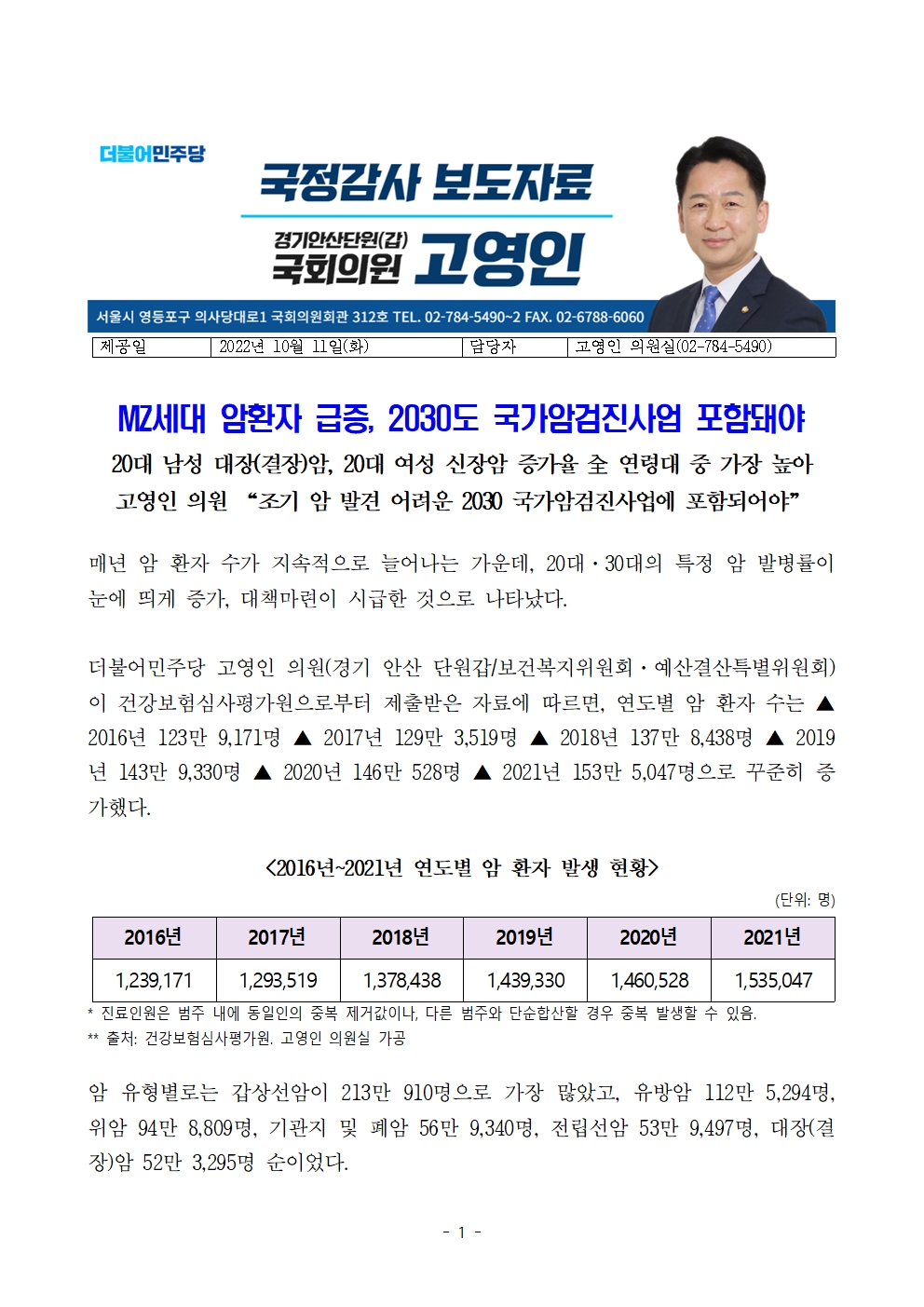 [국회의원 고영인] MZ세대 암환자 급증, 2030도 국가암검진사업 포함돼야