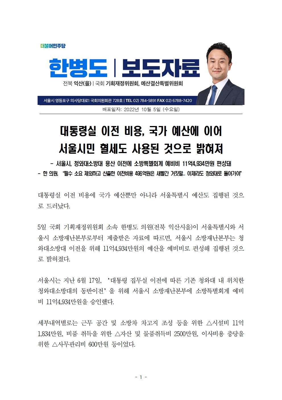[국회의원 한병도] 대통령실 이전비용, 국가 예산에 이어 서울시민 혈세도 사용된 것으로 밝혀져 (22.10.05)