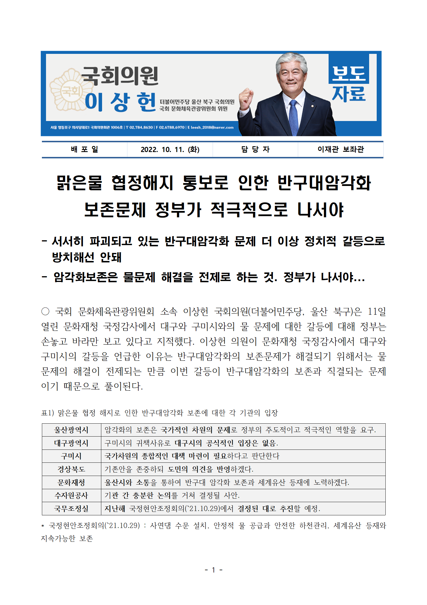 20221011이상헌의원_보도자료_국정감사_이상헌_의원,_맑은물_협정해지_통보로_인한_반구대암각화_보존문제_정부가.hwp