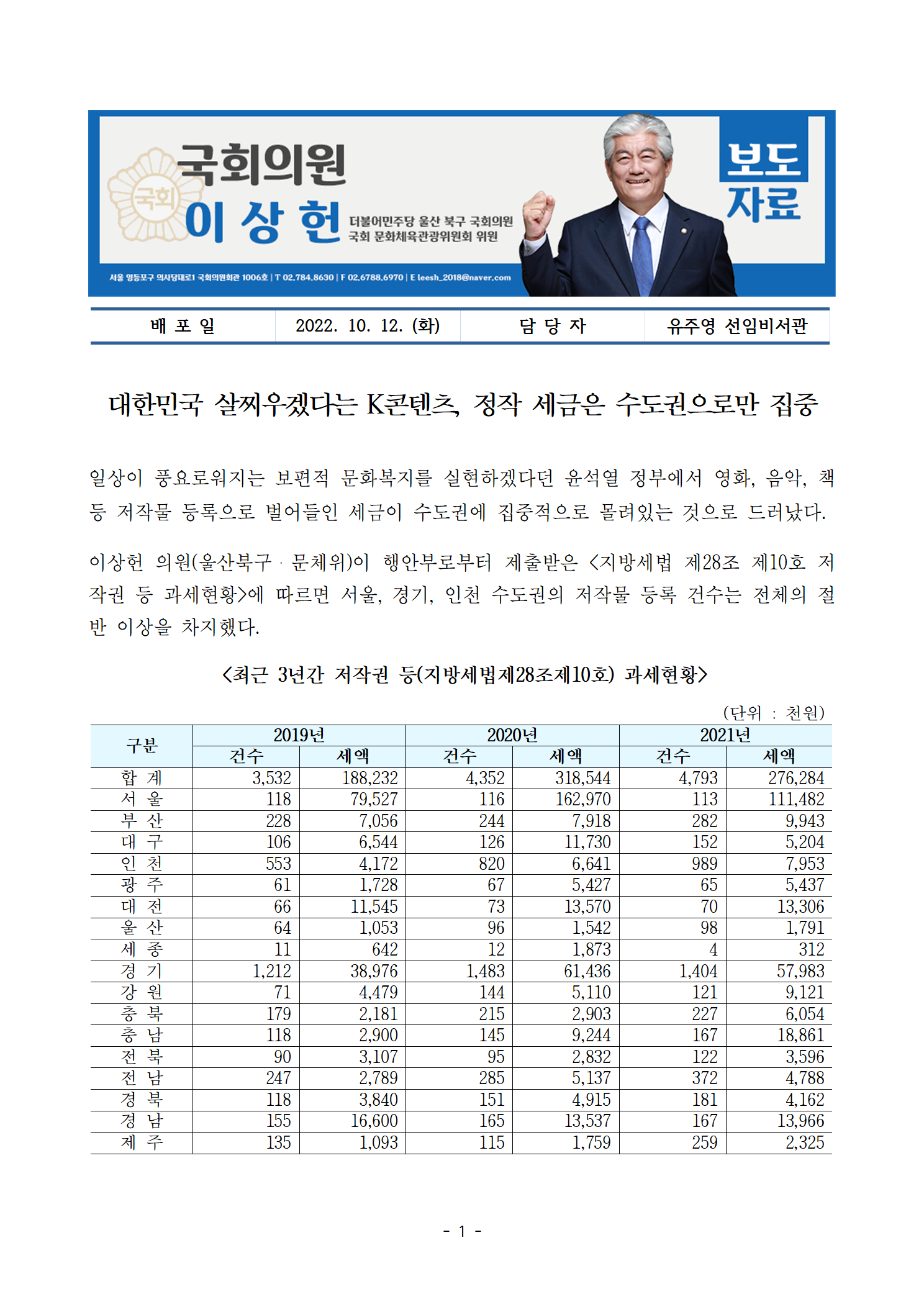이상헌_의원_보도자료_대한민국_살찌우겠다는_K콘텐츠,_정작_세금은_수도권으로만_집중_221012.hwp