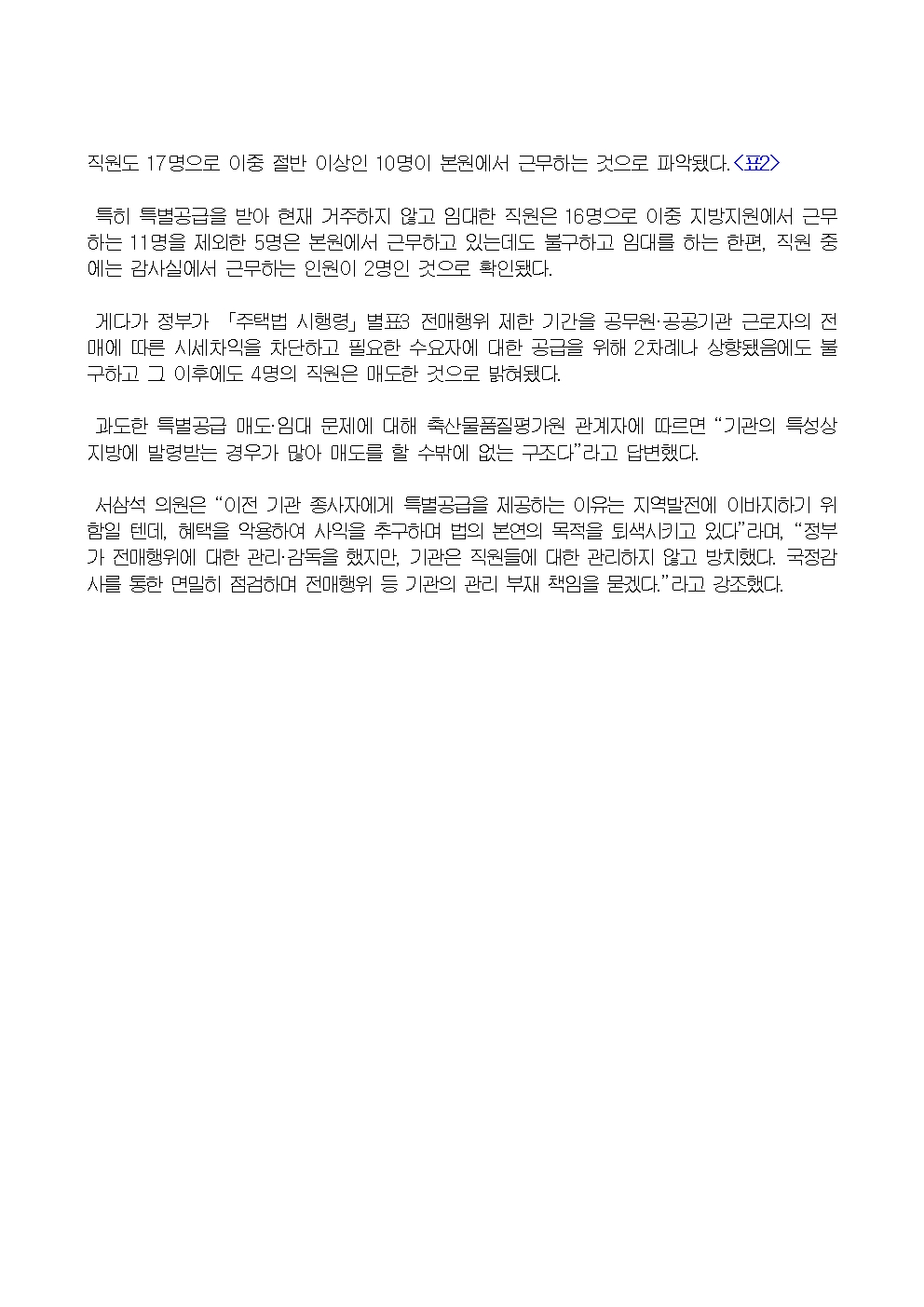 [국회의원 서삼석] 특별공급 받은 축산물품질평가원 직원 2명 중 1명은 아파트 매도·임대