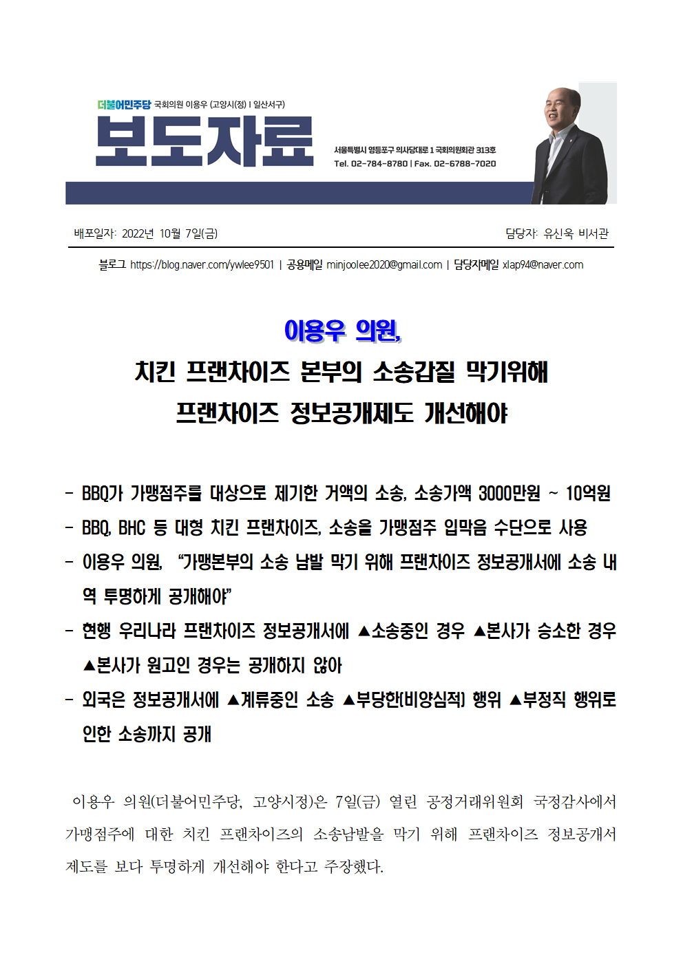 [이용우 의원 보도자료] 이용우 의원, 치킨 프랜차이즈 본부의 소송갑질 막기위해 프랜차이즈 정보공개제도 개선해야