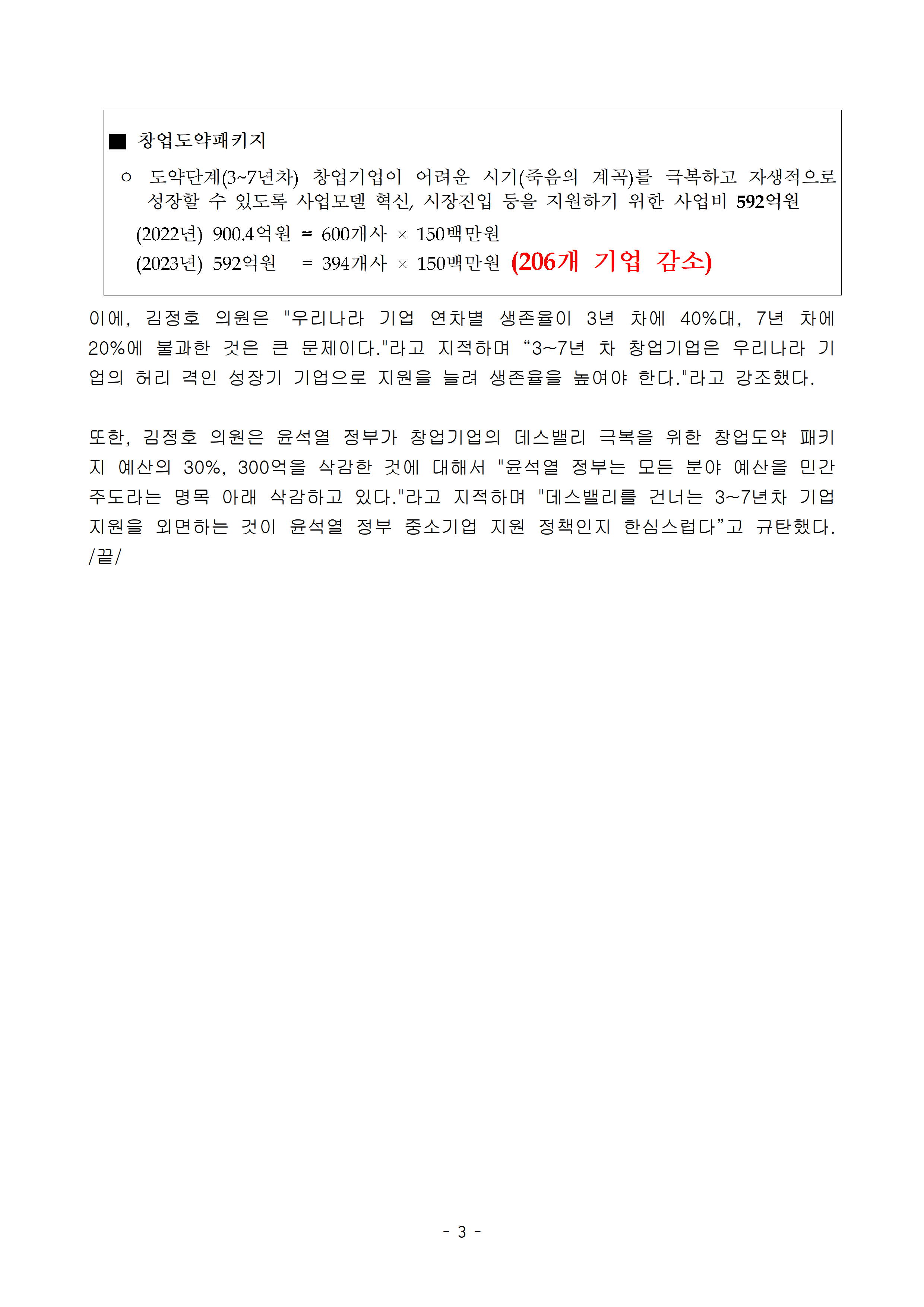 [국회의원 김정호] 김정호 의원, 최근 5년간 중소기업 생존율 3년차 40%, 7년차 20%에 불과, 윤석열 정부 관련 예산 300억 감액