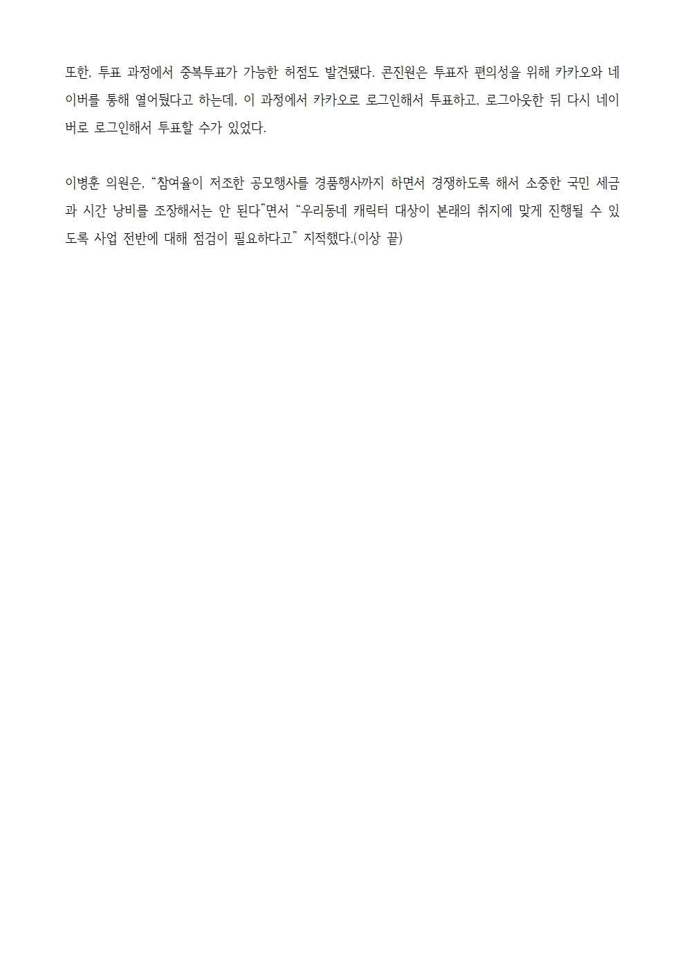[이병훈 의원 보도자료] 매표행위, 중복투표로 얼룩진 ‘문체부 주최 우리동네 캐릭터 대상’