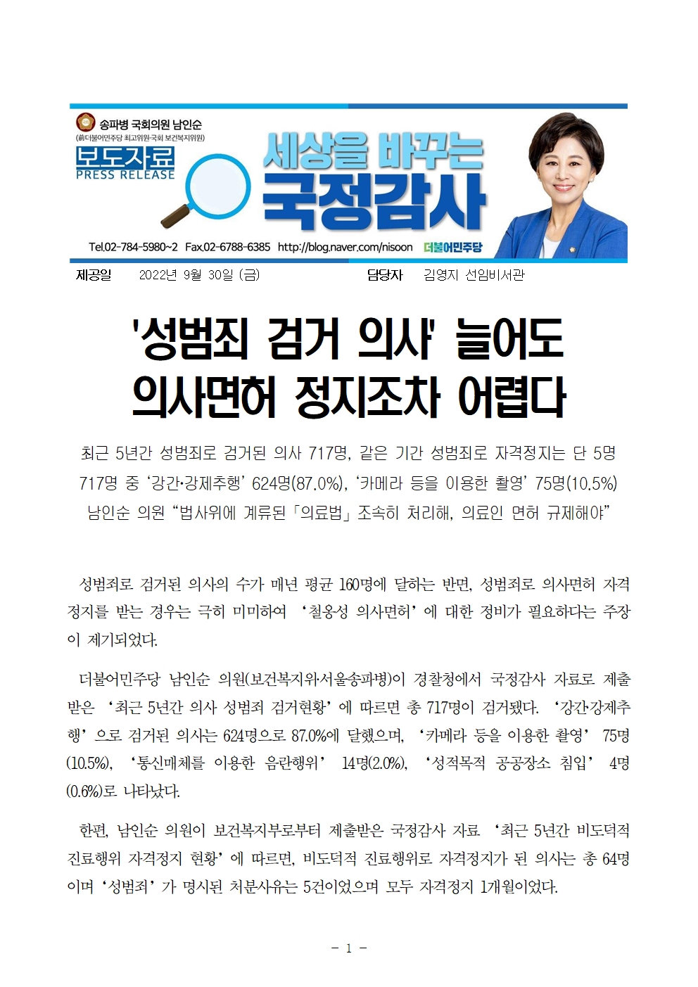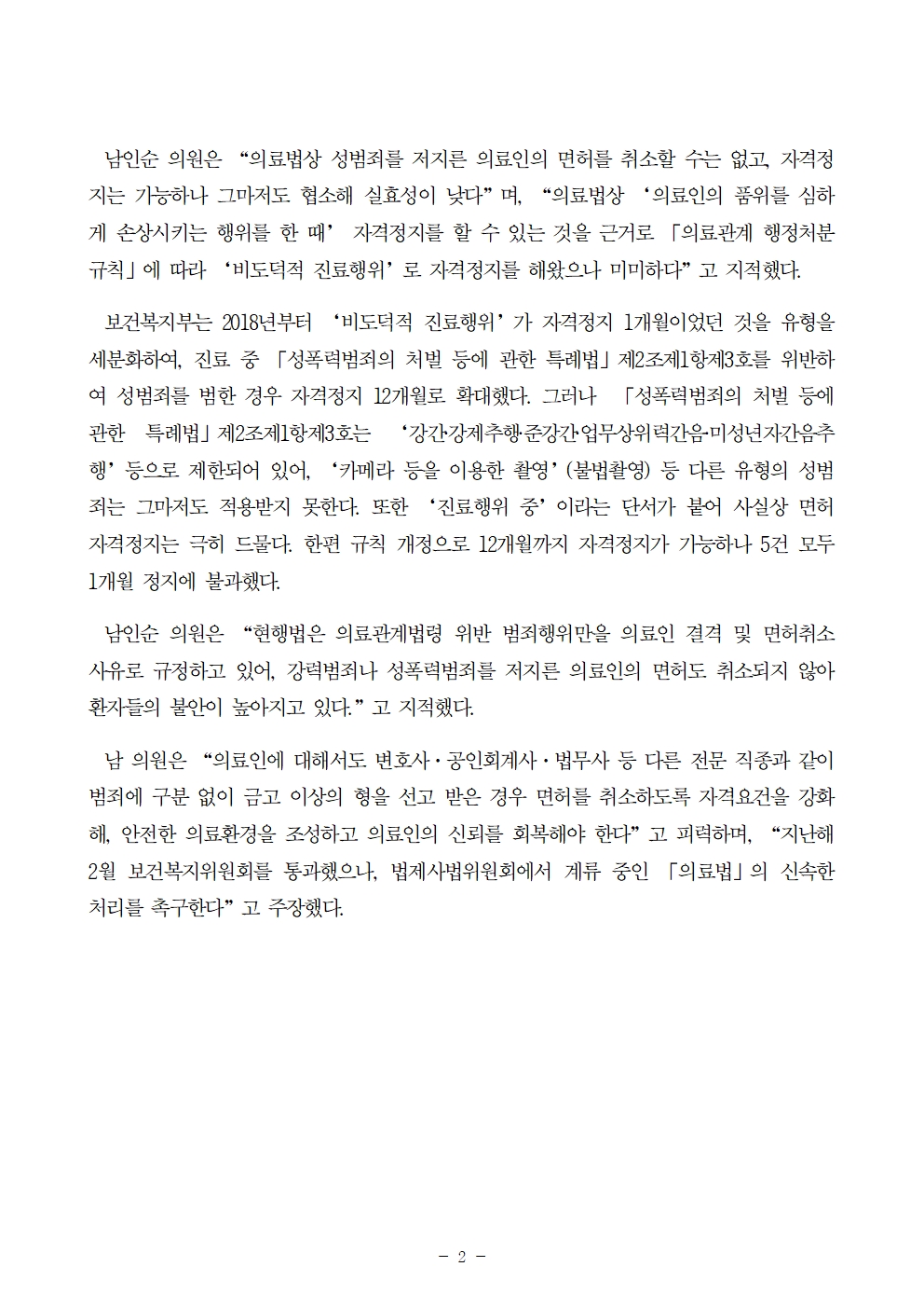 [국회의원 남인순] '성범죄 검거 의사' 늘어도 의사면허 정지조차 어렵다