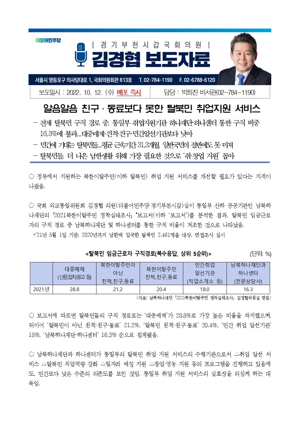 221012_김경협의원실_보도자료_알음알음_친구동료보다_못한_탈북민_취업지원_서비스.hwp