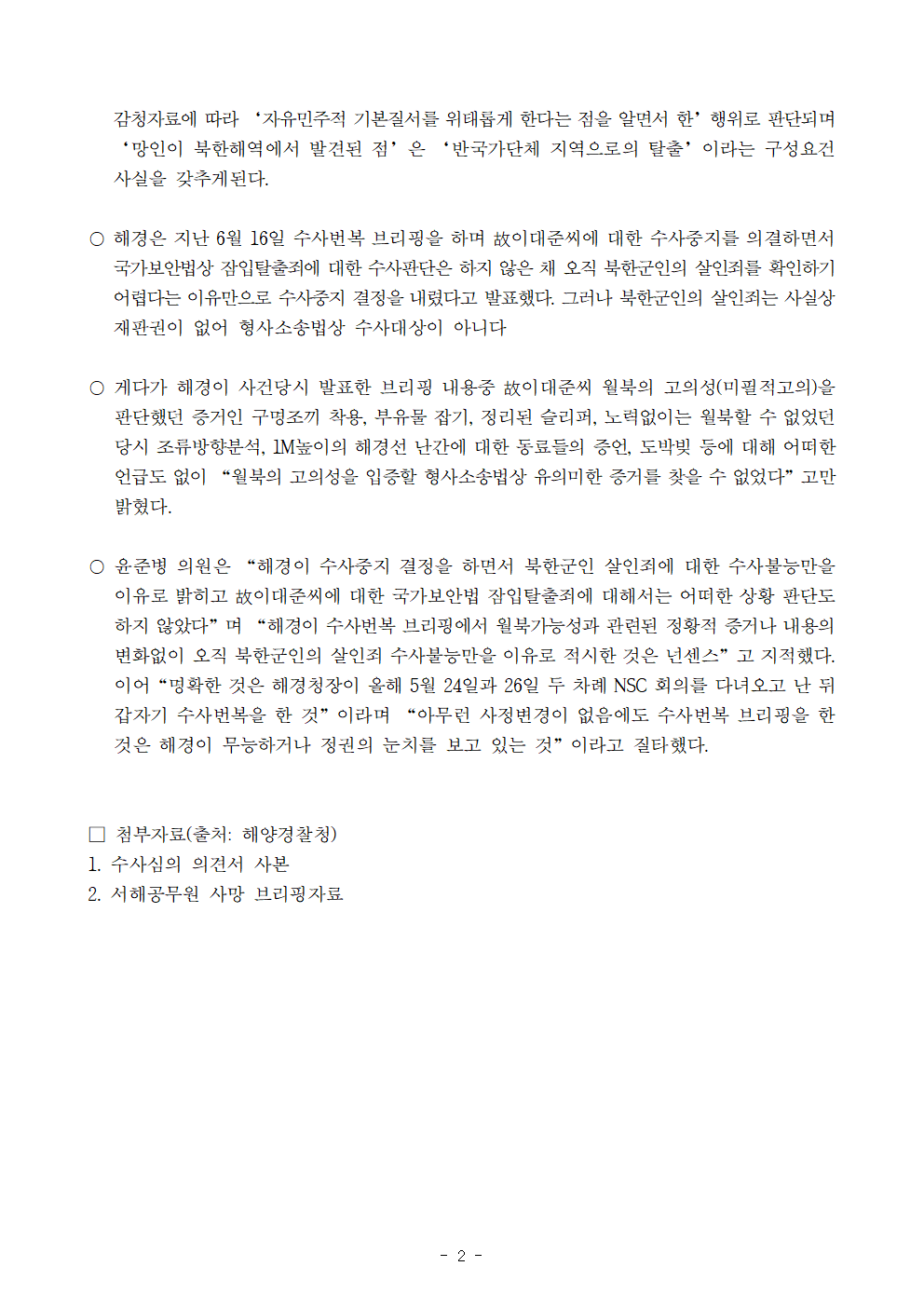[윤준병 의원 보도자료] 윤석열 정부의 짜맞추기식 전정부공격에 놀아난 해경... 월북판단증거 변화없어