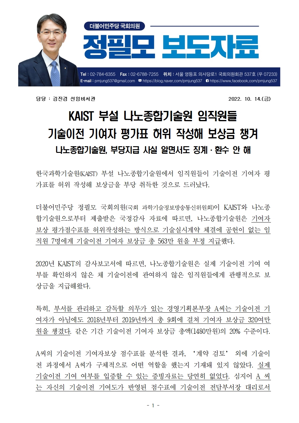 [정필모 의원실] KAIST 부설 나노종합기술원 임직원들 기술이전 기여자 평가표 허위 작성해 보상금 챙겨