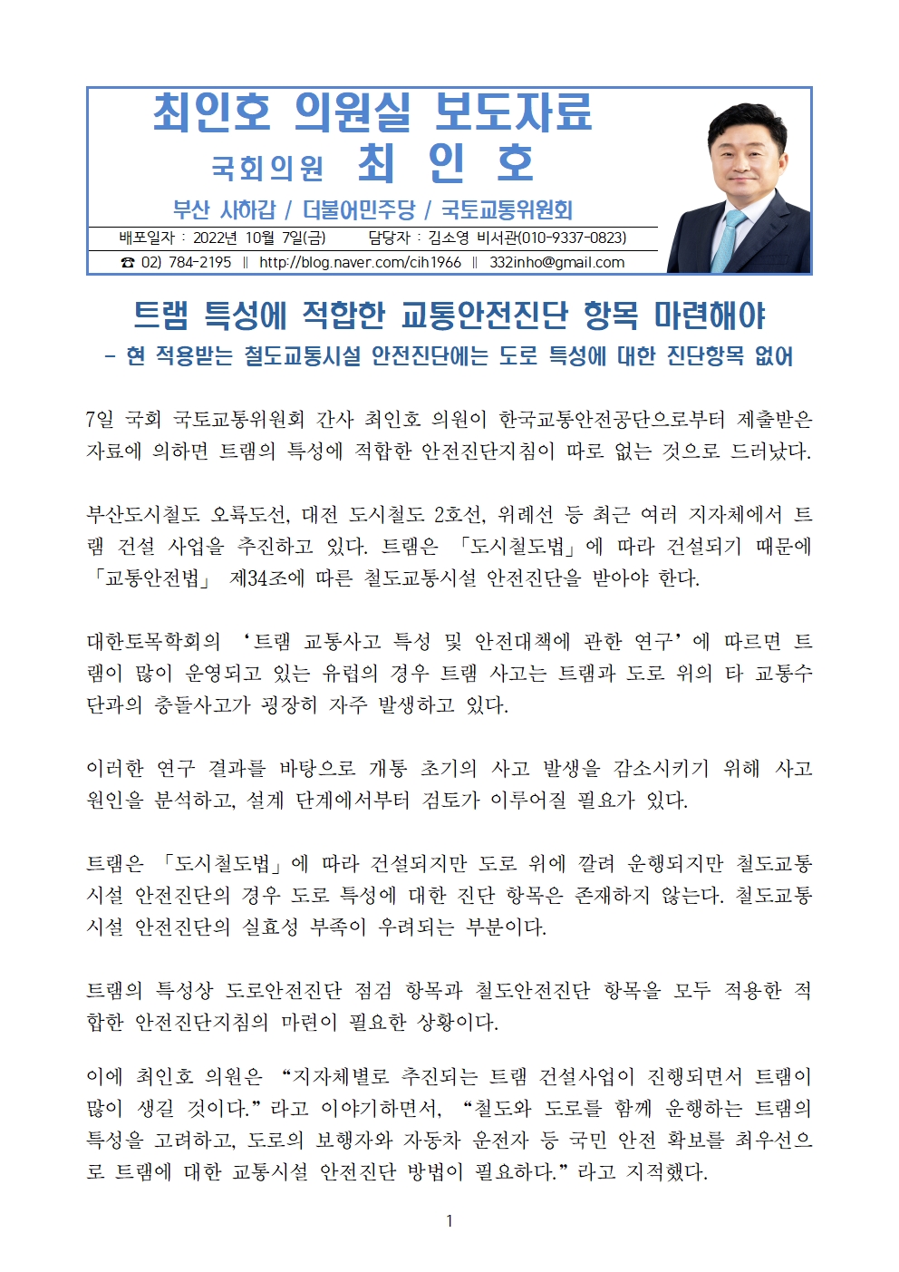 [최인호 의원 보도자료]한국교통안전공단, 트램 특성에 적합한 교통안전진단 항목 마련해야