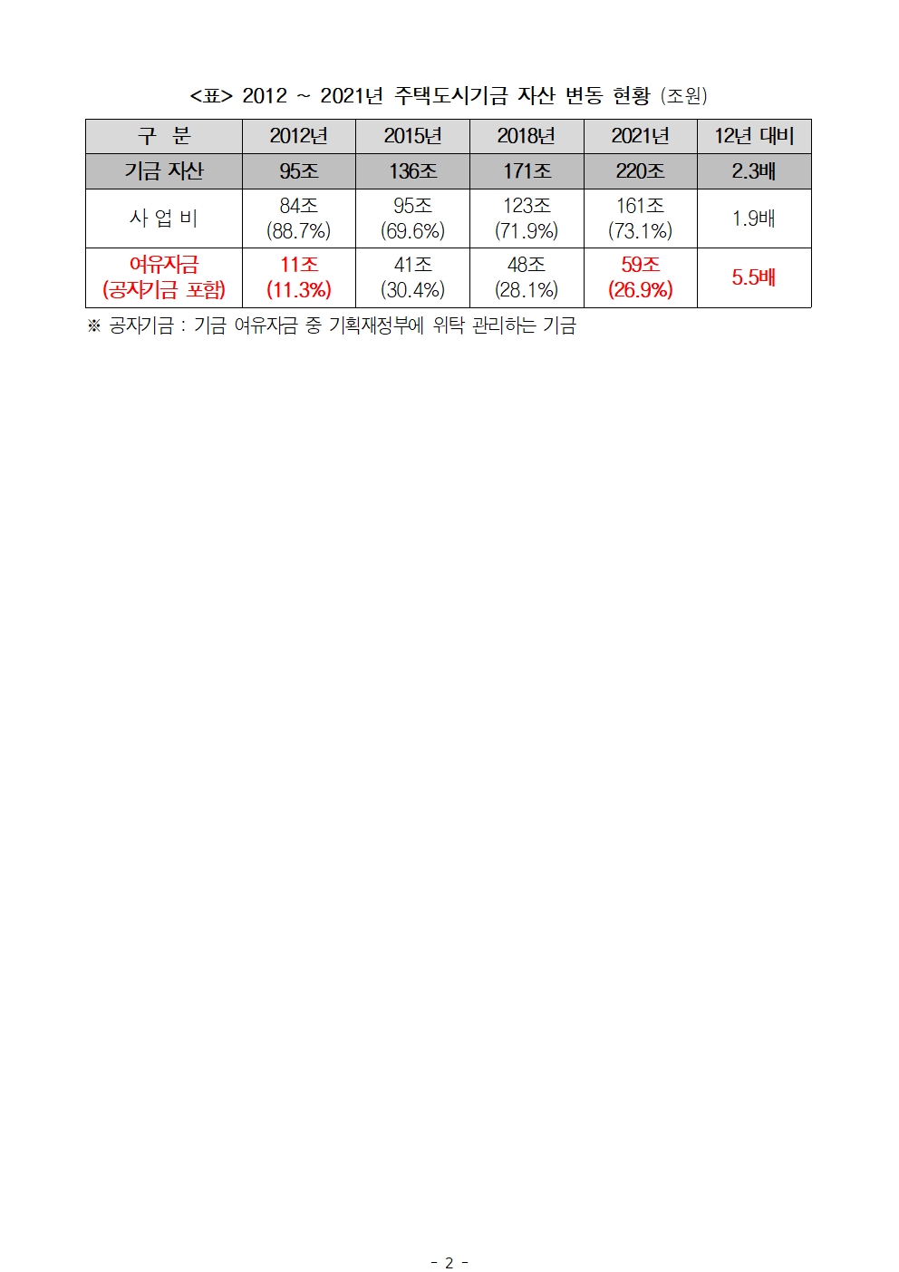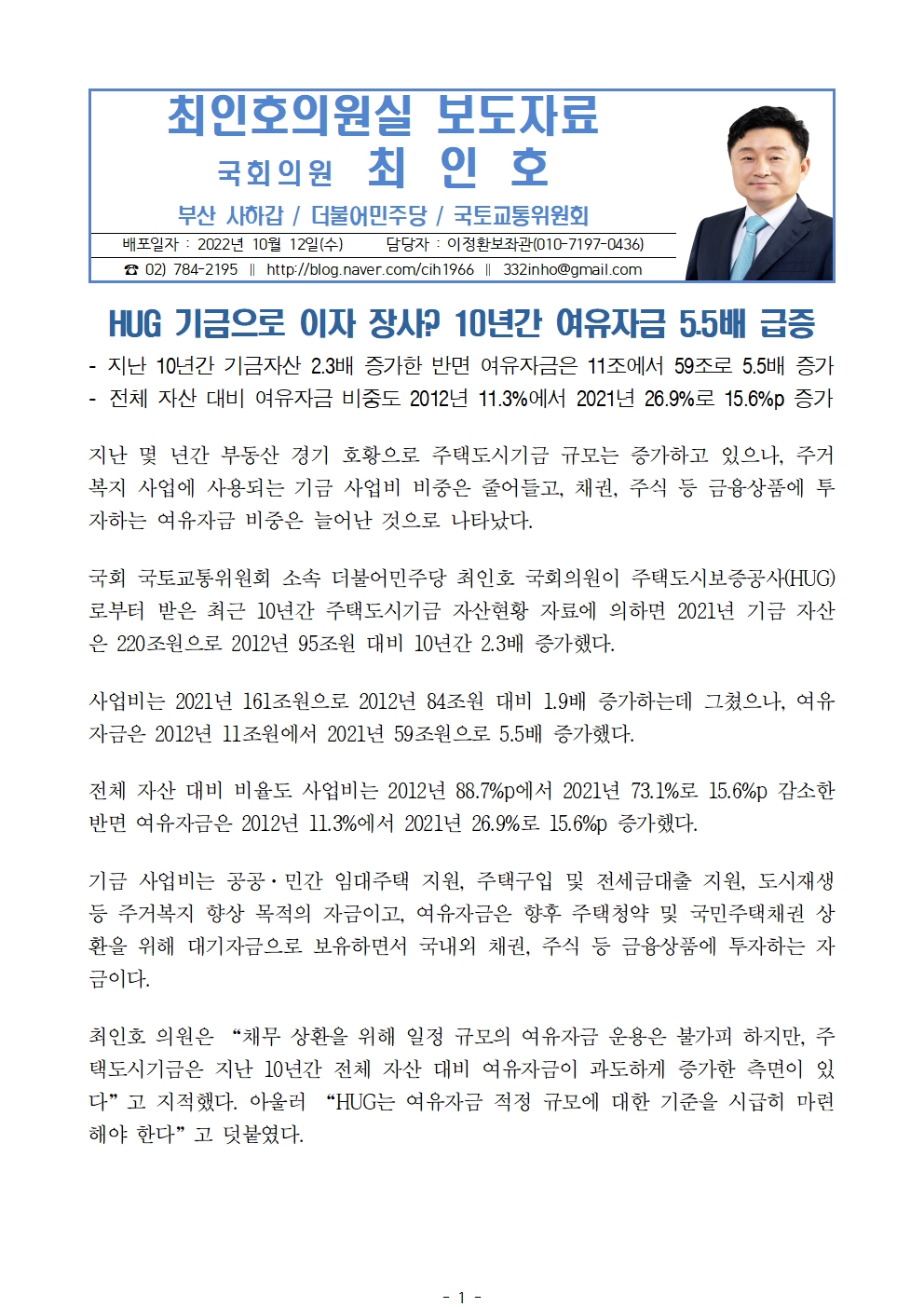[최인호 의원 보도자료]HUG, 기금으로 이자 장사? 10년간 여유자금 5.5배 급증