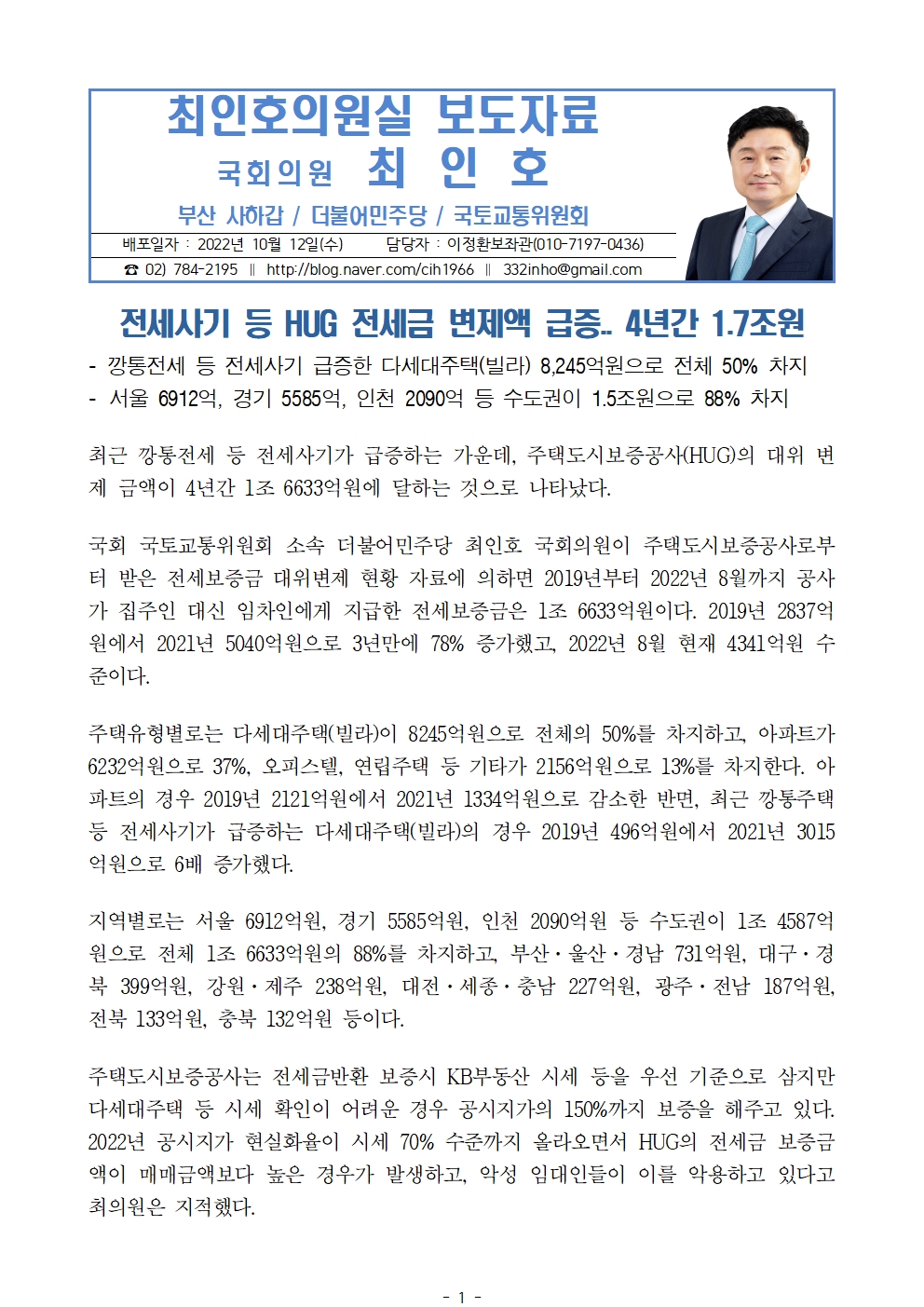 [최인호 의원 보도자료]HUG, 전세사기 등 HUG 전세금 변제액 급증.. 4년간 1.7조원