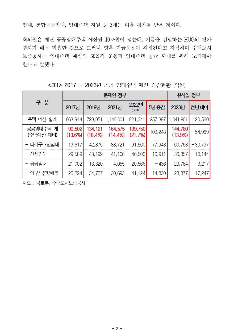 [최인호 의원 보도자료]HUG, 문재인 정부 5년간 공공 임대주택 예산 11조 증가했는데, 윤석열 정부 1년 만에 5.5조원 삭감