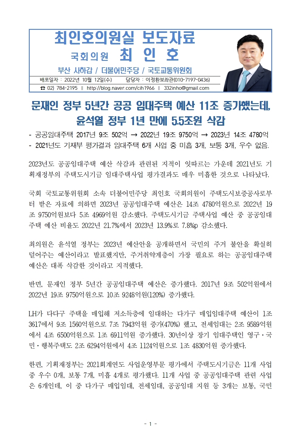 최인호_의원_임대예산_문정부_5년간_11조_증가_윤정부_1년만에_5_5조_삭감.hwp