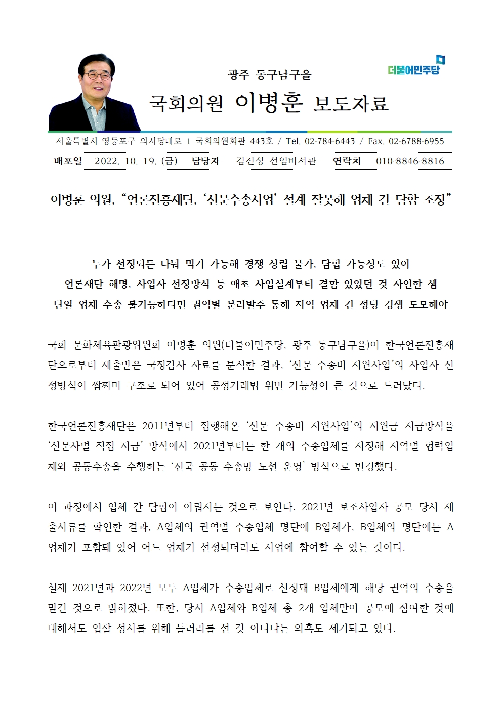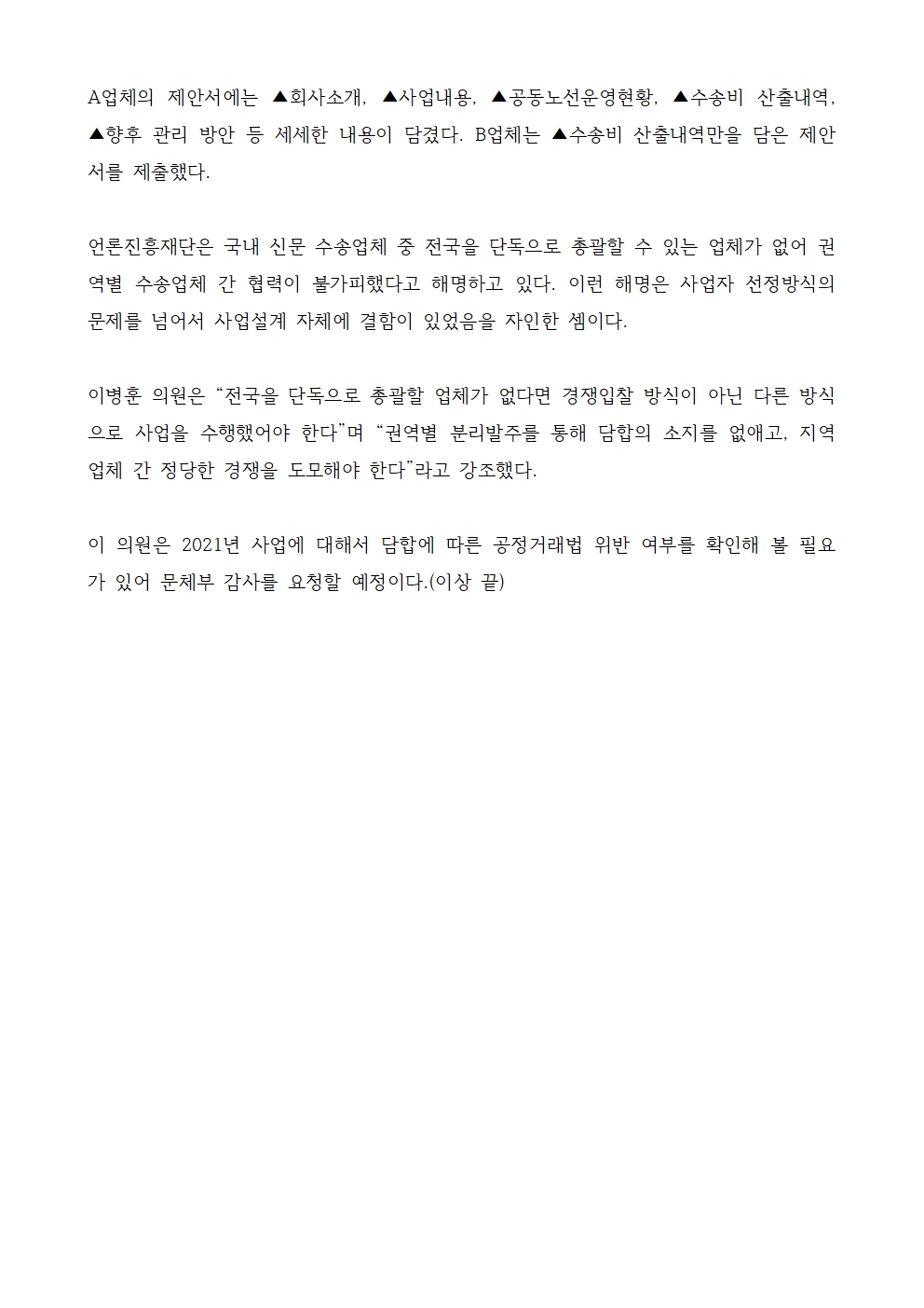 221019_이병훈_국정감사_보도자료(문체위)_짬짜미식_신문수송_사업자_선정,_공정거래법_위반_소지_수정.hwp
