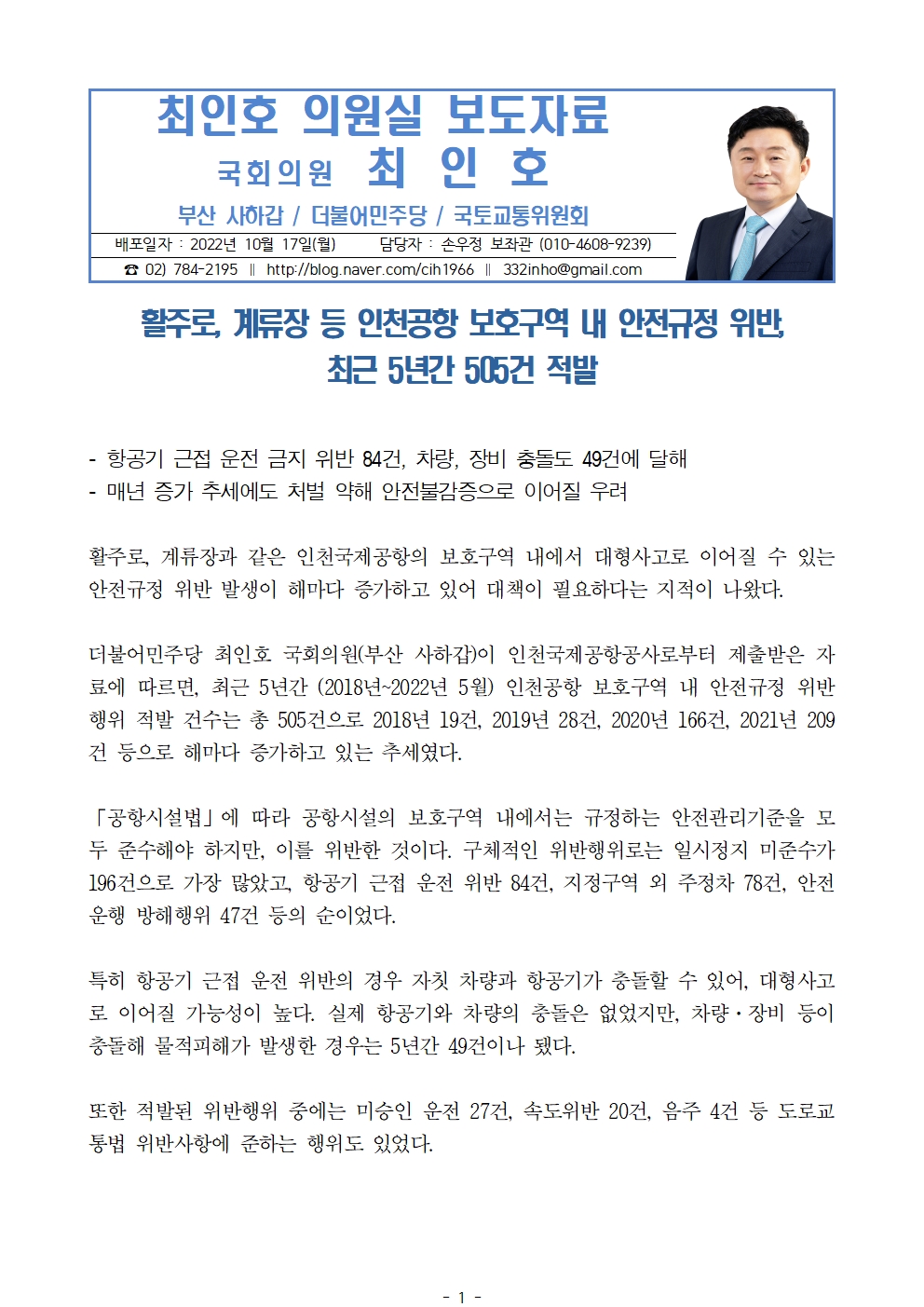 [최인호 의원 보도자료] 활주로, 계류장 등 인천공항 보호구역 내 안전규정 위반, 최근 5년간 505건 적발