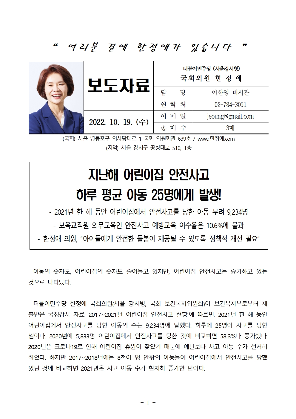 221019_한정애_의원_보도자료_작년_하루_평균_아동_25명에게_어린이집_안전사고_발생.hwp