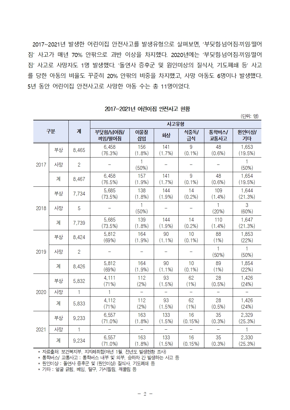 [한정애 의원 보도자료] 작년 하루 평균 아동 25명에게 어린이집 안전사고 발생