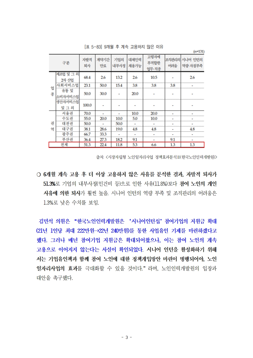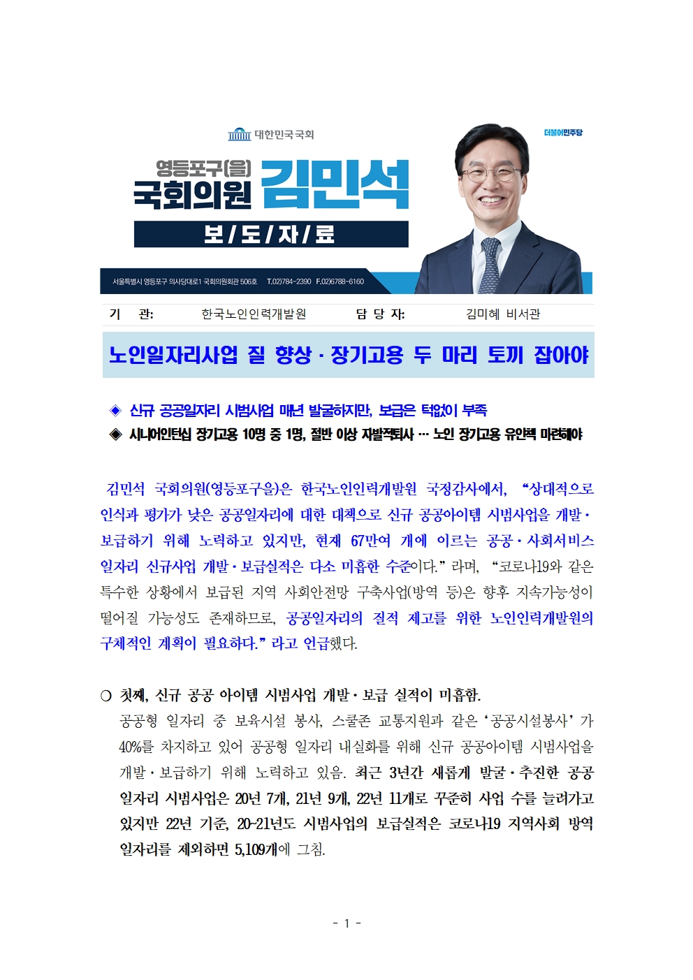 [김민석의원 보도자료] 노인일자리사업 질 향상·장기고용 두 마리 토끼 잡아야