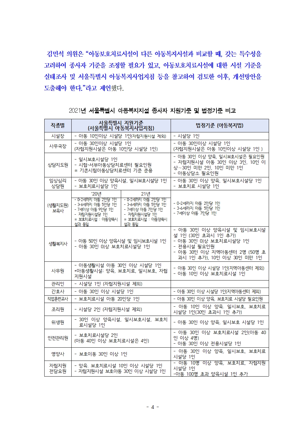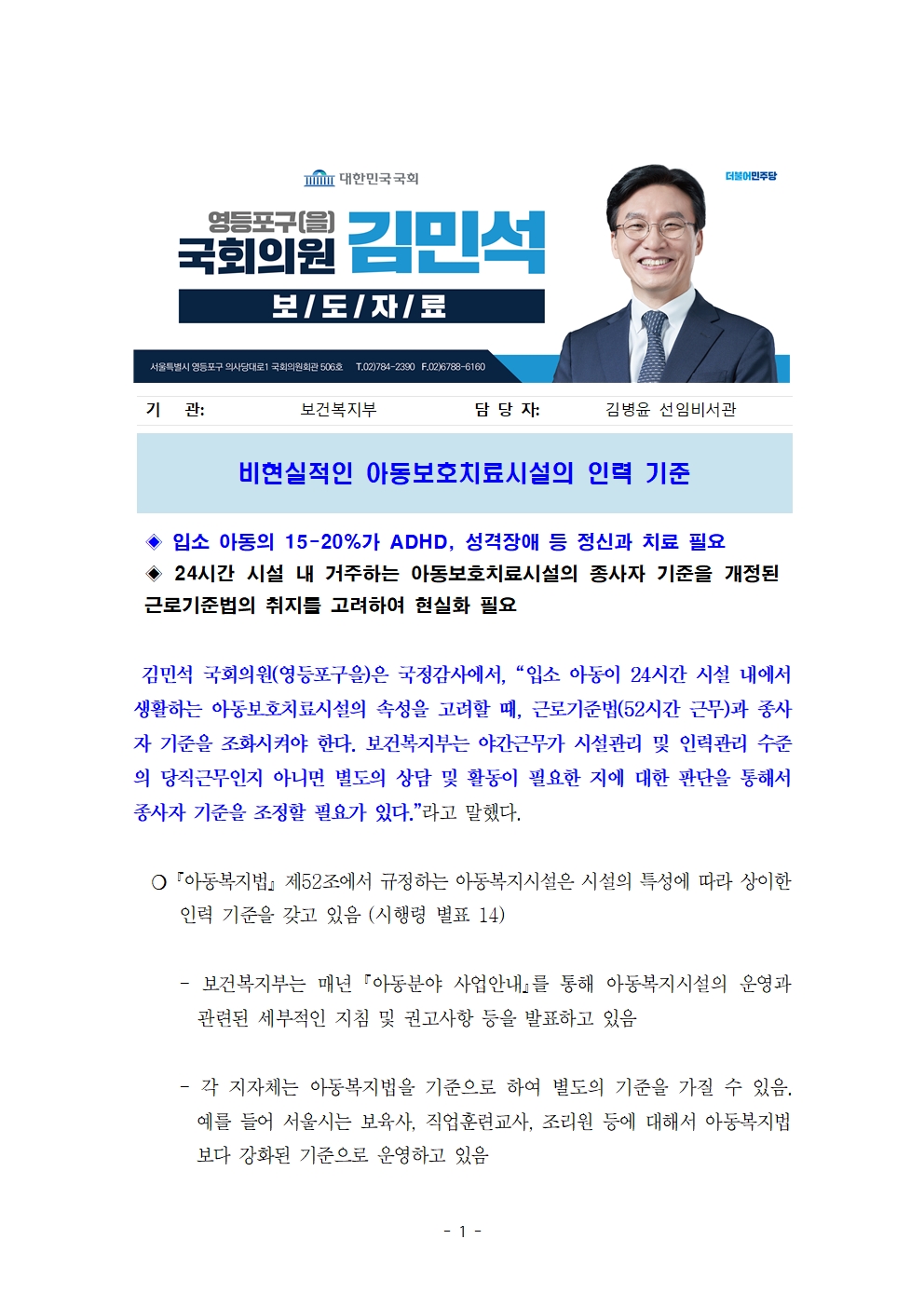 [김민석의원 보도자료] 비현실적인 아동보호치료시설의 인력 기준