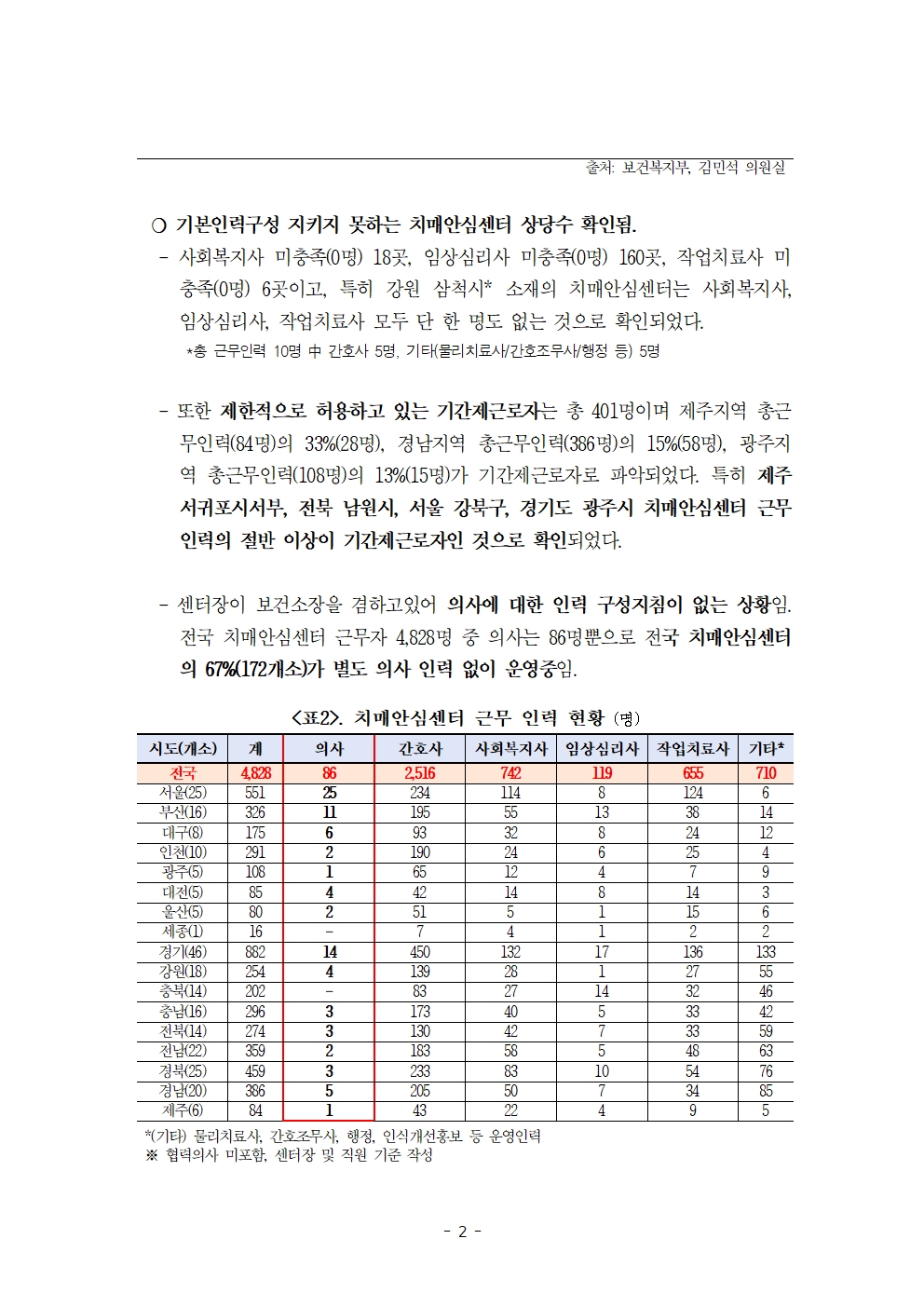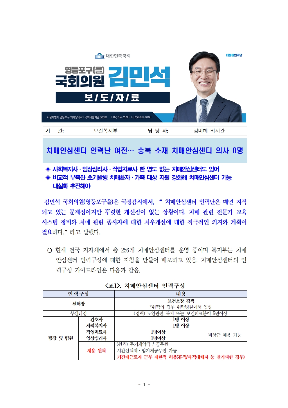 [김민석의원 보도자료] 치매안심센터 인력난 여전… 충북 소재 치매안심센터 의사 0명