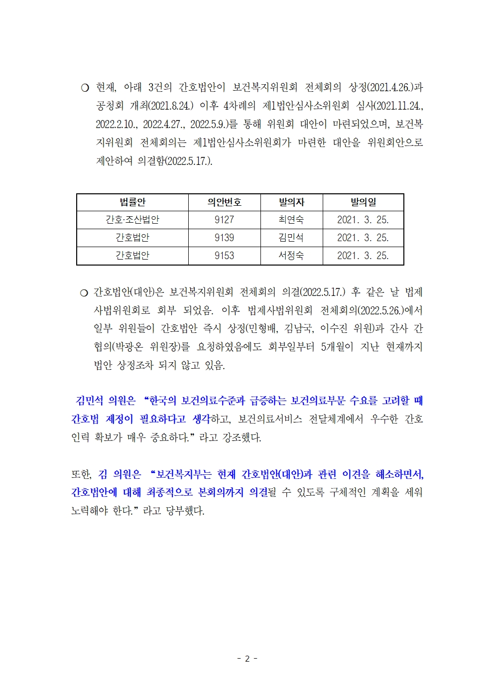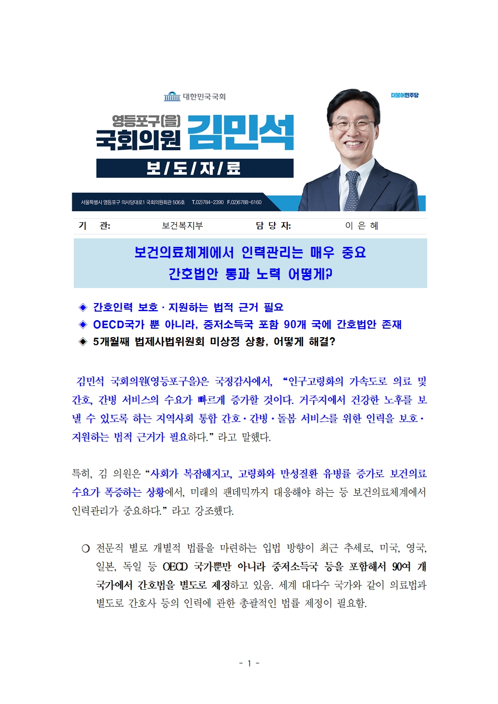 [김민석의원 보도자료] 보건의료체계에서 인력관리는 매우 중요 간호법안 통과 노력 어떻게?