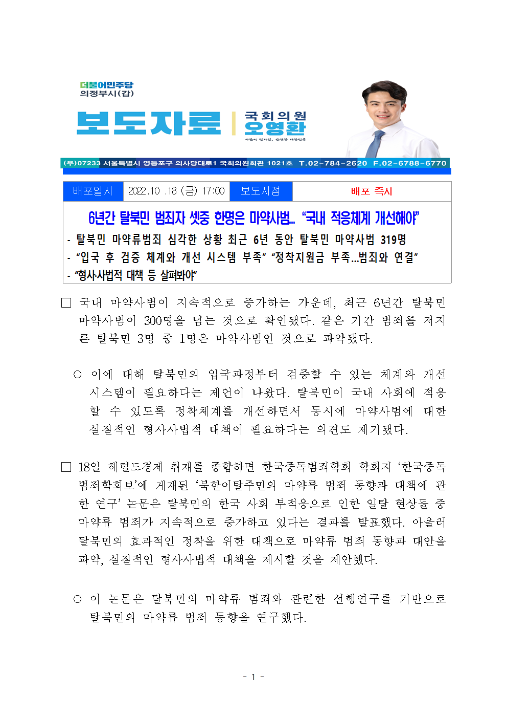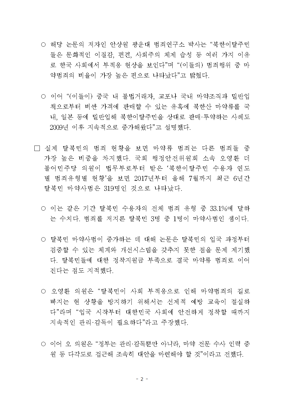 [국회의원 오영환] 6년간 탈북민 범죄자 셋 중 한명은 마약사범 국내 적응체계 개선해야