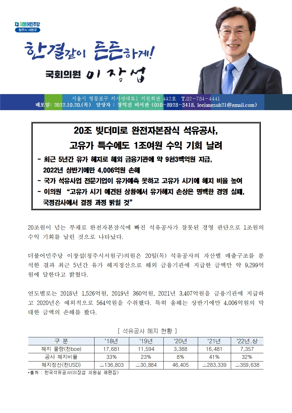[국회의원 이장섭]20조 빚더미로 완전자본잠식 석유공사, 고유가 특수에도 1조여원 수익 기회 날려