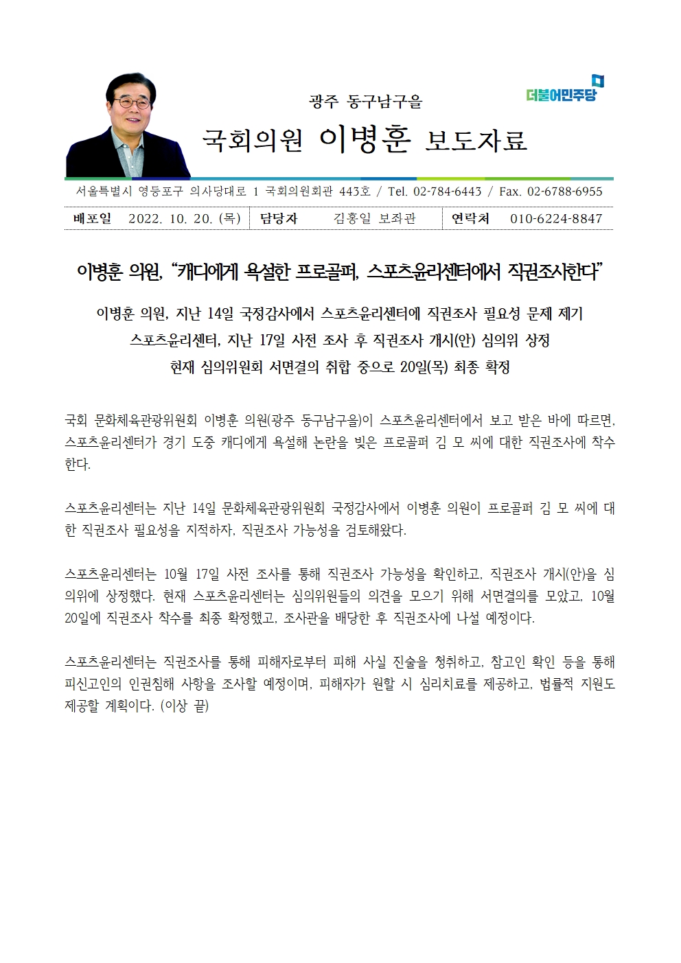 221020_이병훈_국감_보도자료_프로골퍼_김한별_스포츠윤리센터에서_직권조사한다.hwp