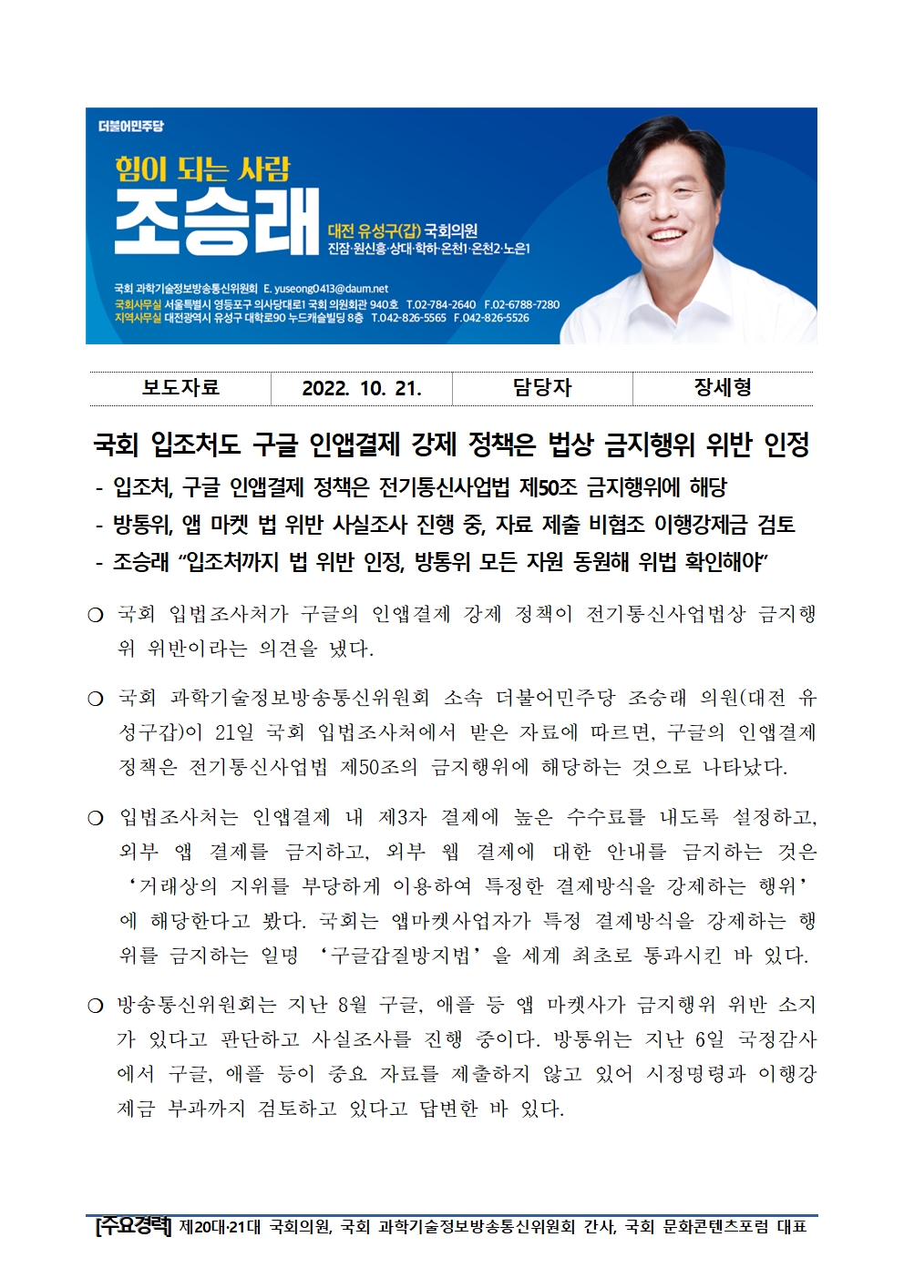 [국회의원 조승래] 국회 입조처도 구글 인앱결제 강제 정책은 법상 금지행위 위반 인정