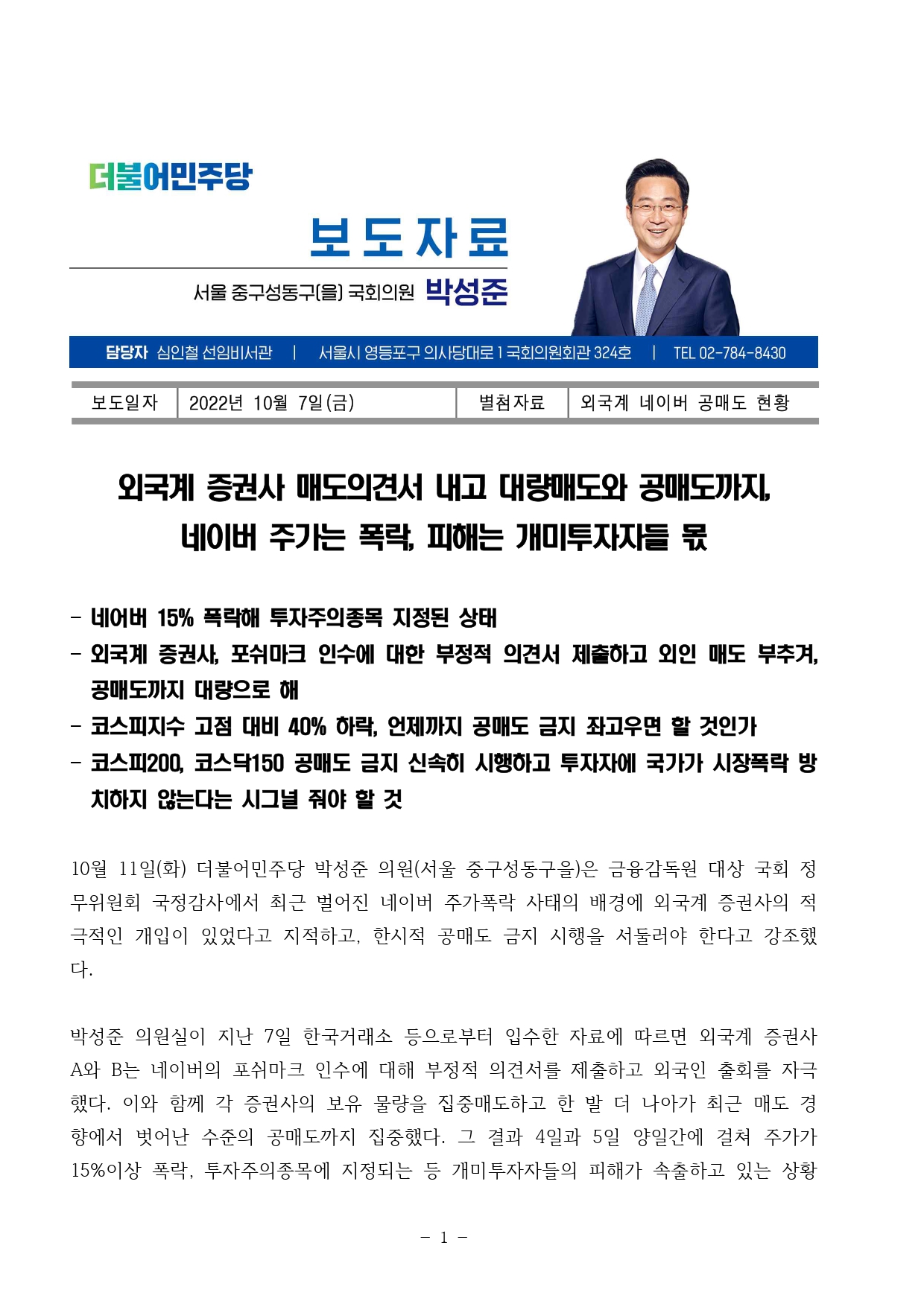 221007)_보도자료_박성준_의원_외국계_증권사_매도의견내고_대량매도와_공매도,_네이버주가폭락,_피해는_개미들_몫.hwp