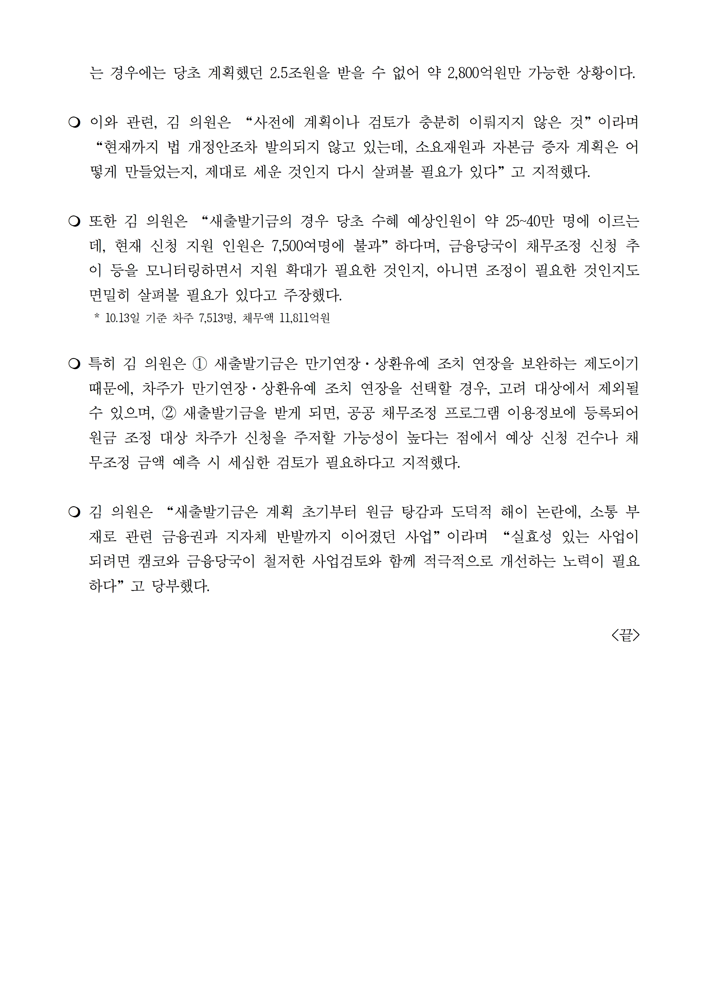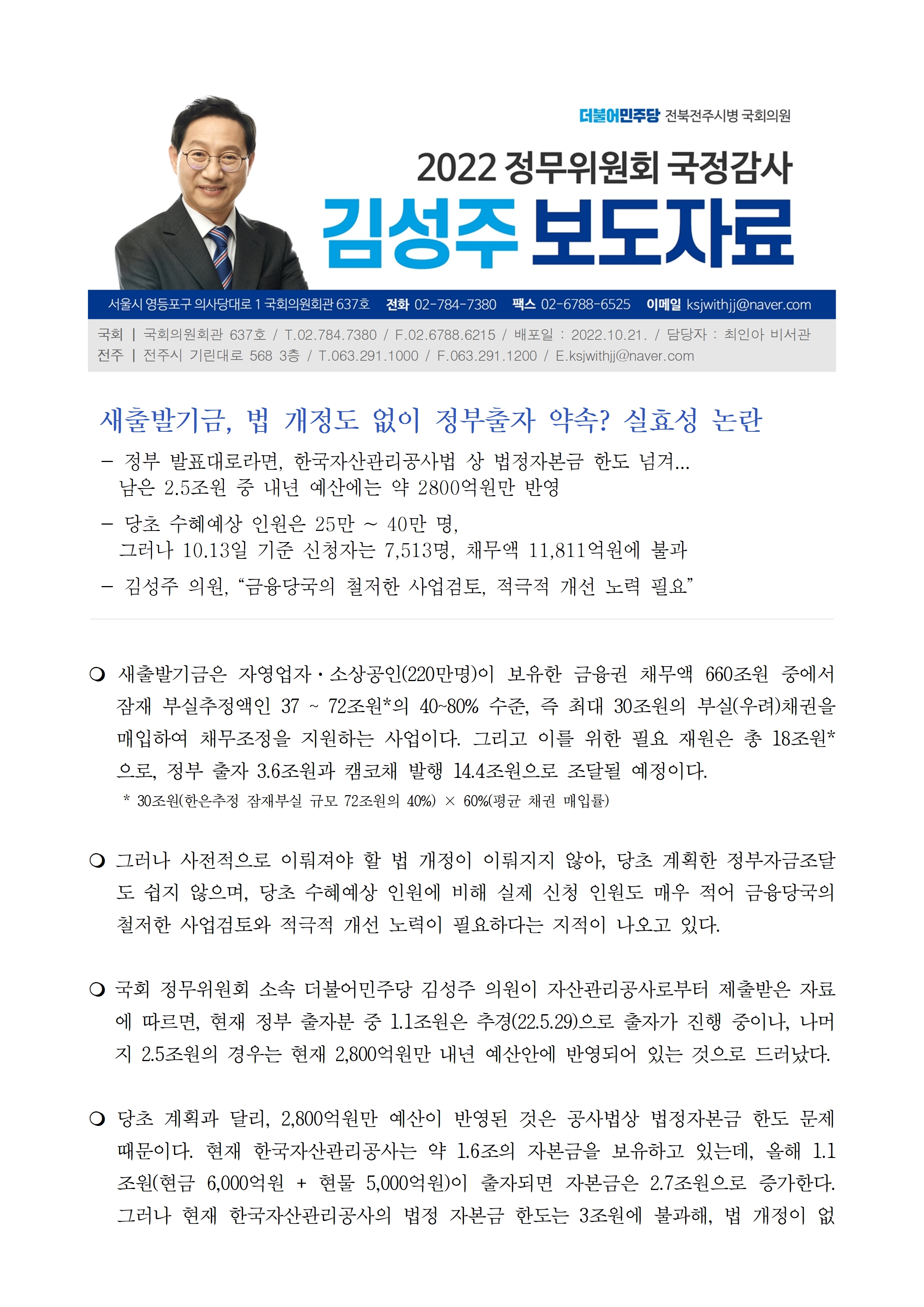 [김성주의원 보도자료] 새출발기금, 법 개정도 없이 정부출자 약속? 실효성 논란