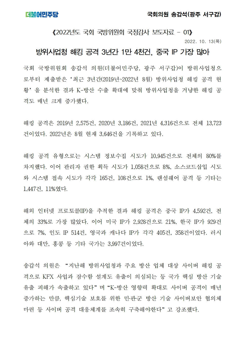 [국회의원 송갑석 보도자료] 방위사업청 해킹 공격 3년간 1만 4천건, 중국 IP 가장 많아