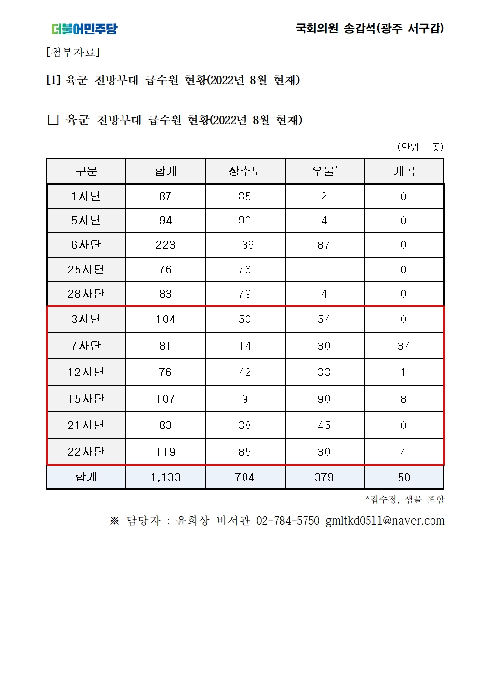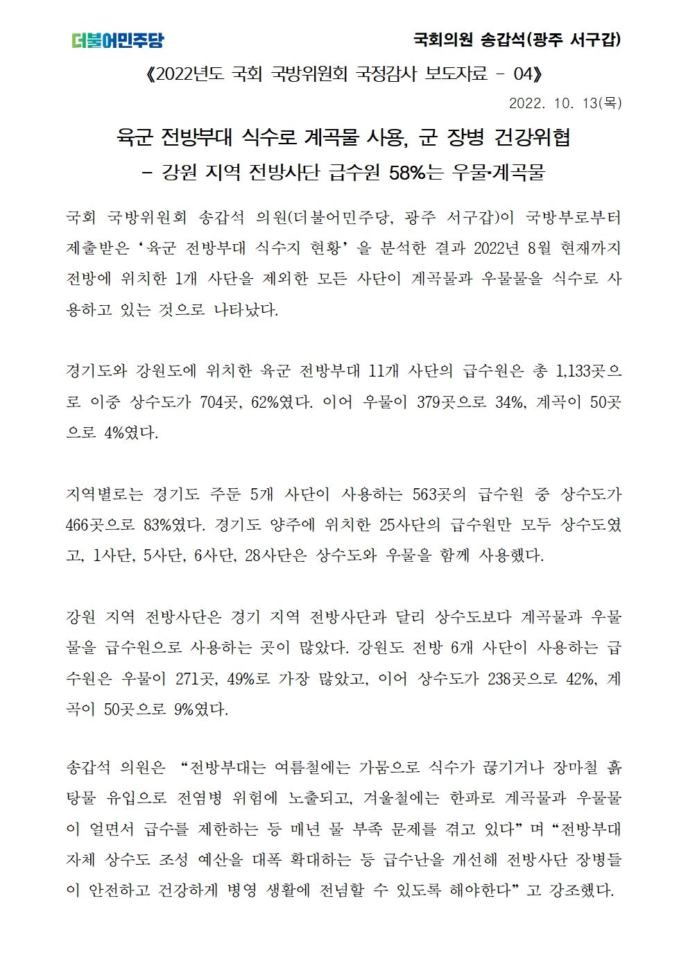 [국회의원 송갑석 보도자료] 육군 전방부대 식수로 계곡물 사용, 군 장병 건강위협