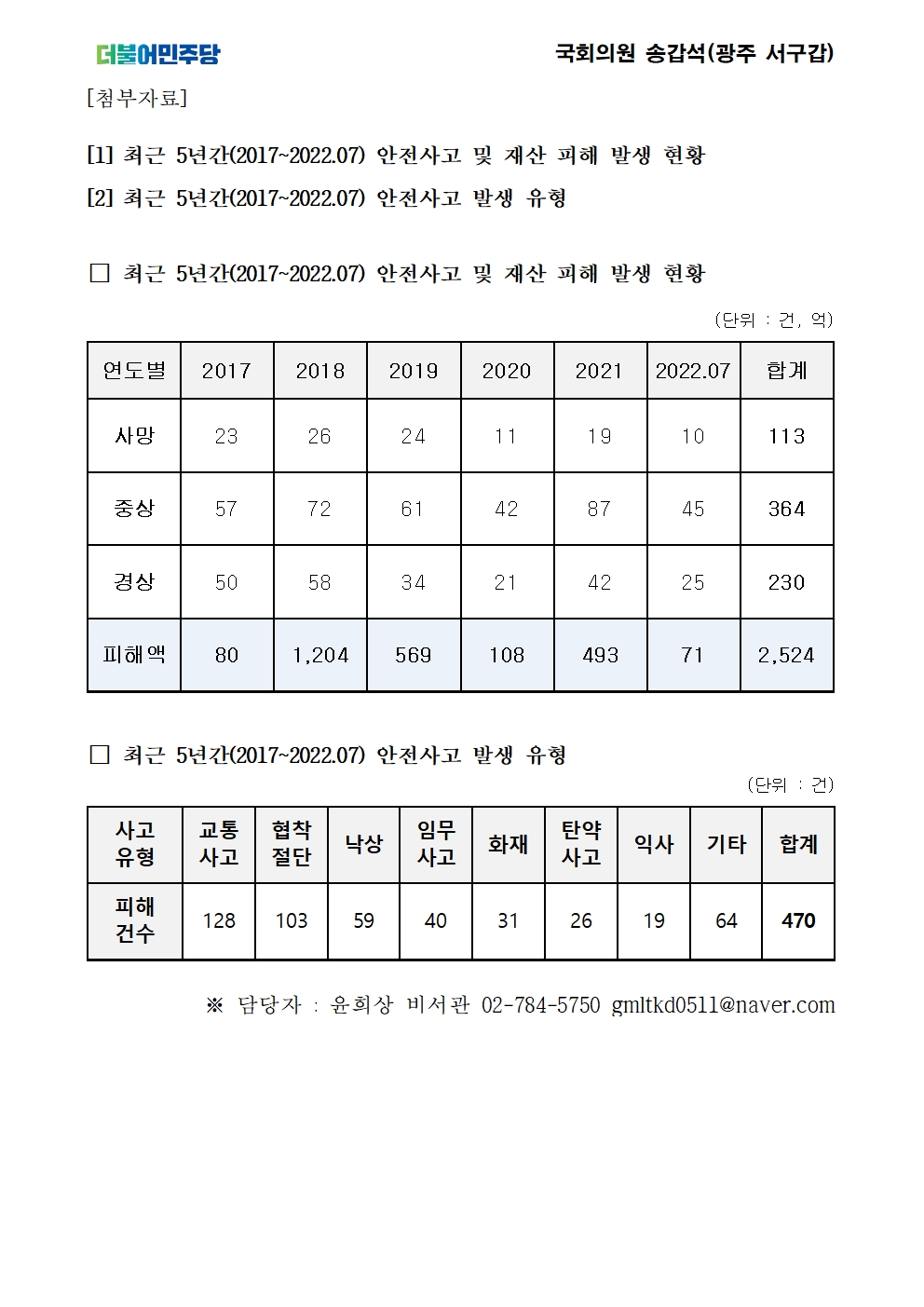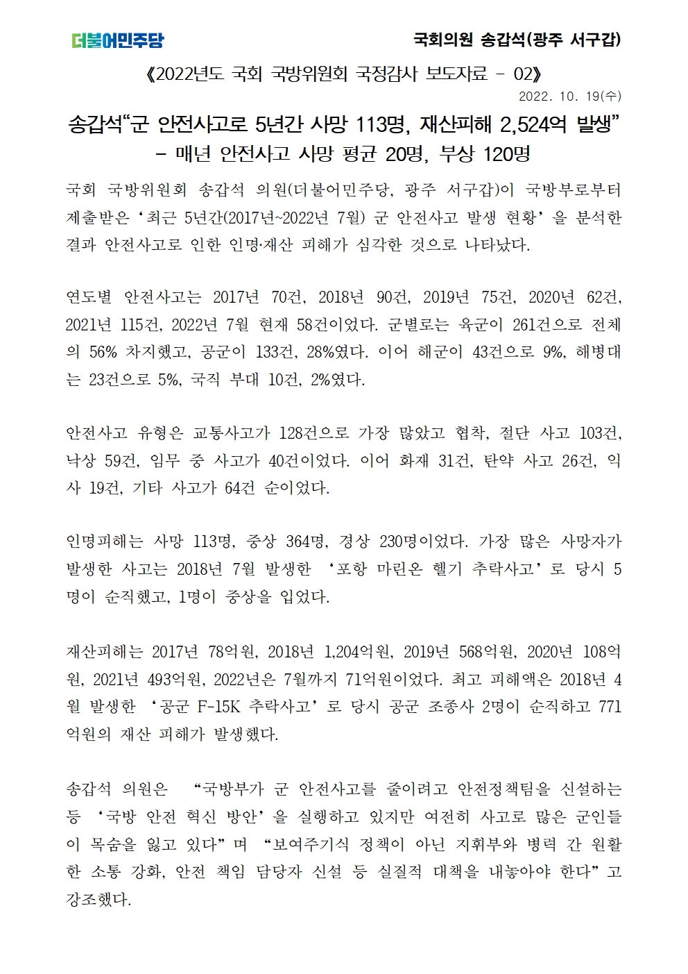 [국회의원 송갑석 보도자료] 송갑석, “군 안전사고로 5년간 사망 113명, 재산피해 2,524억 발생”