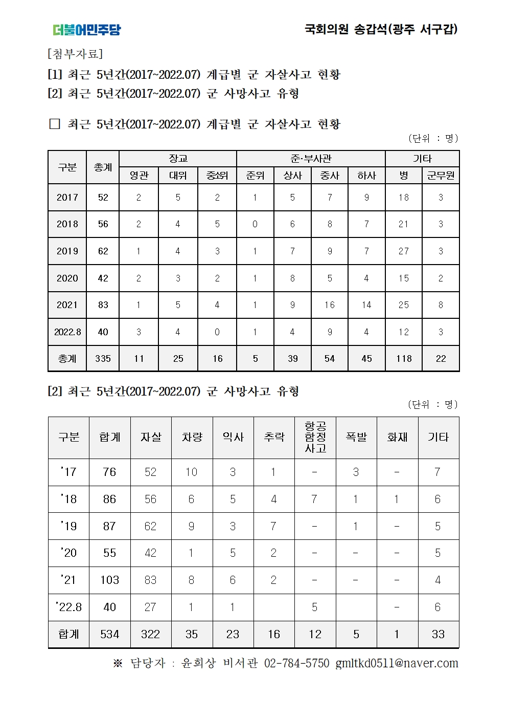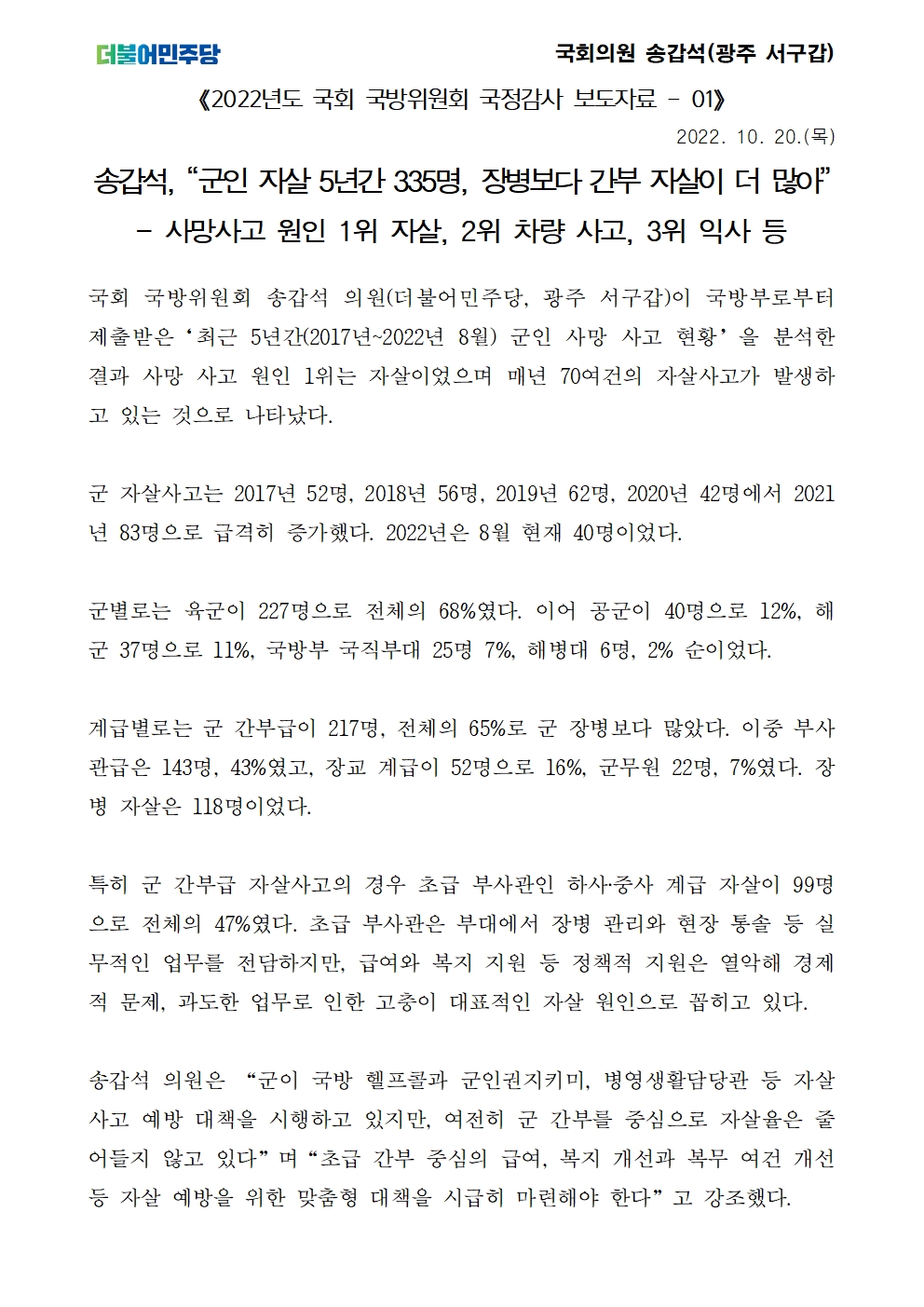 [국회의원 송갑석 보도자료] 송갑석, “군인 자살 5년간 335명, 장병보다 간부 자살이 더 많아”