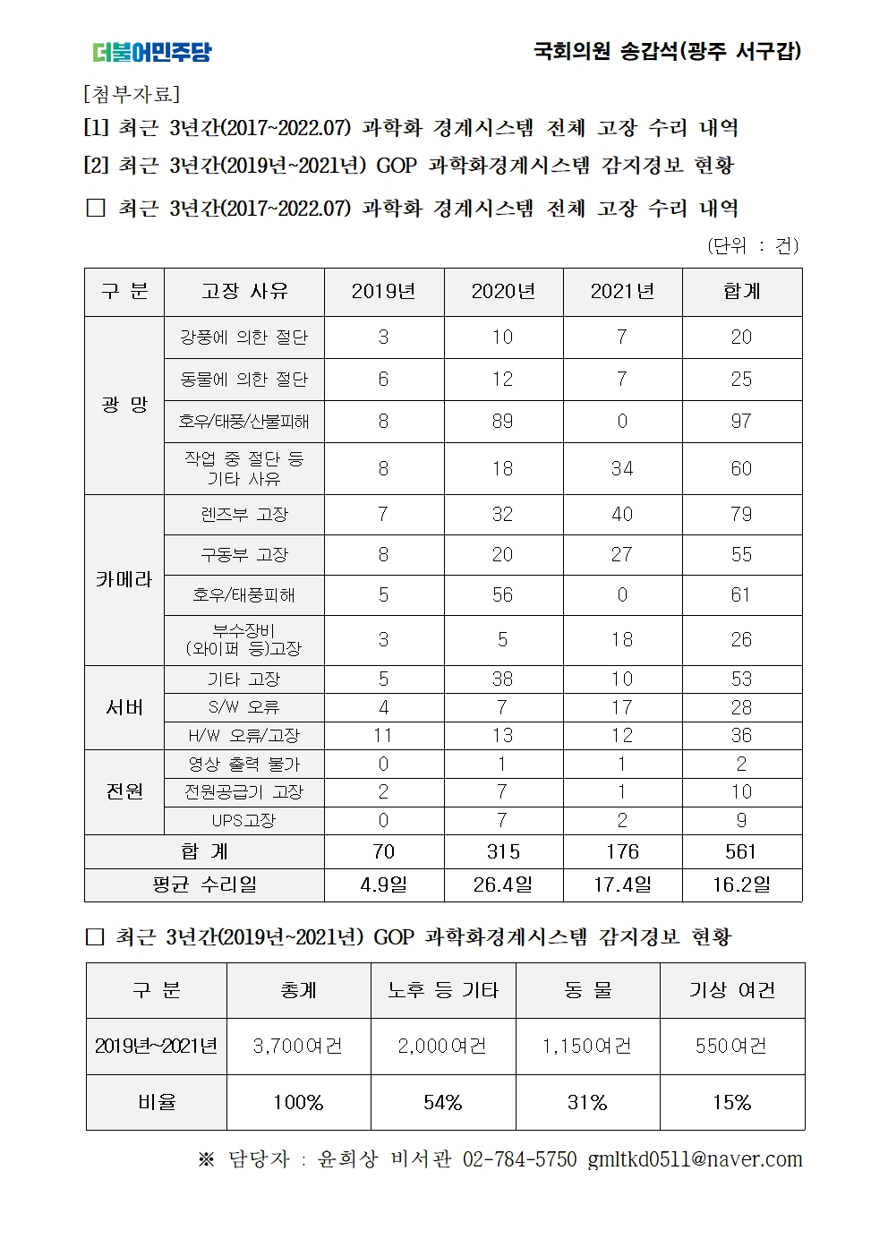 [국회의원 송갑석 보도자료] 송갑석, “전방부대 경계시스템 고장 3년간 561건, 안보 구멍 우려”