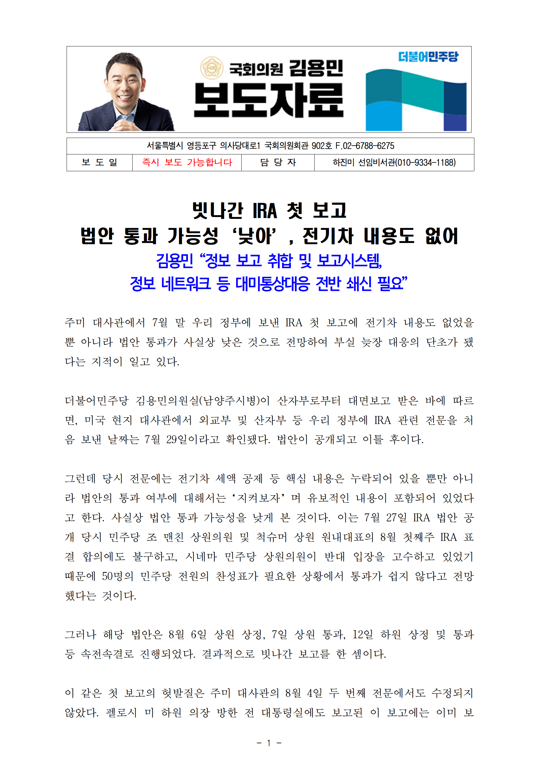 [김용민의원실 보도자료] 빗나간 IRA 첫 보고 법안 통과 가능성‘낮아’, 전기차 내용도 없어