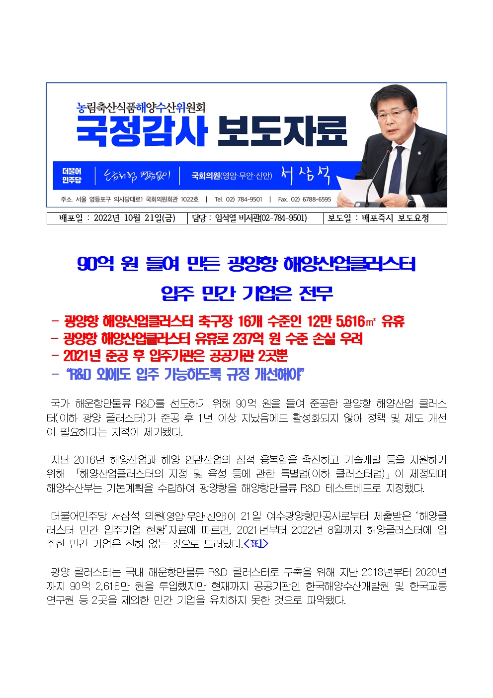 221021_서삼석_의원실_보도자료_90억_원들여_만든_광양항_해양클러스터_입주_민간_기업은_전무.hwp