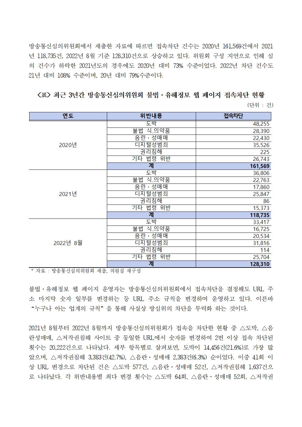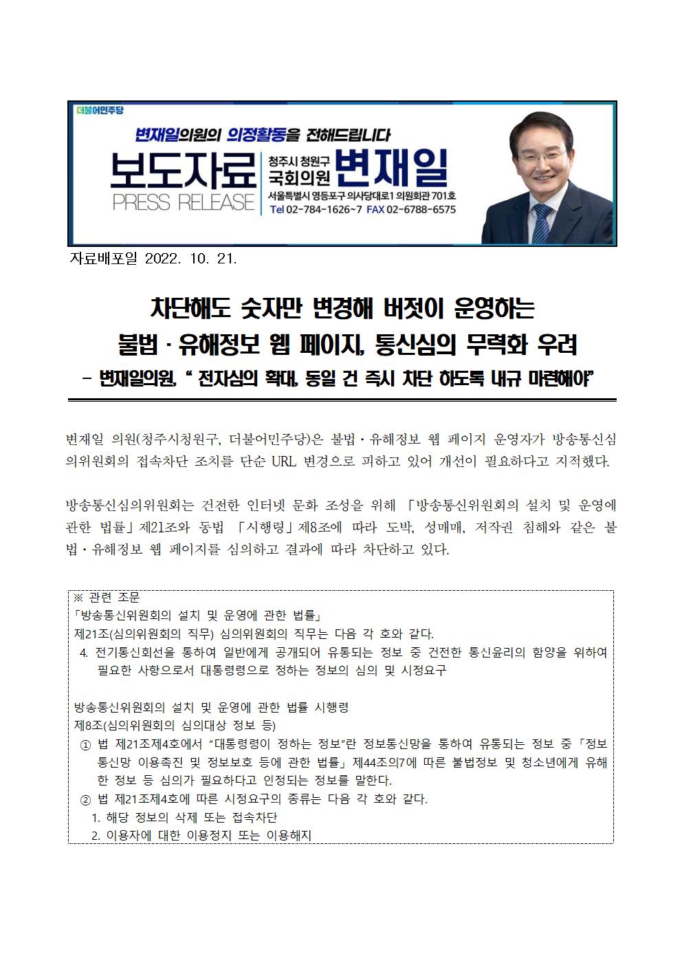 [변재일 의원 보도자료] 차단해도 숫자만 변경해 버젓이 운영하는 불법·유해정보 웹 페이지, 통신심의 무력화 우려
