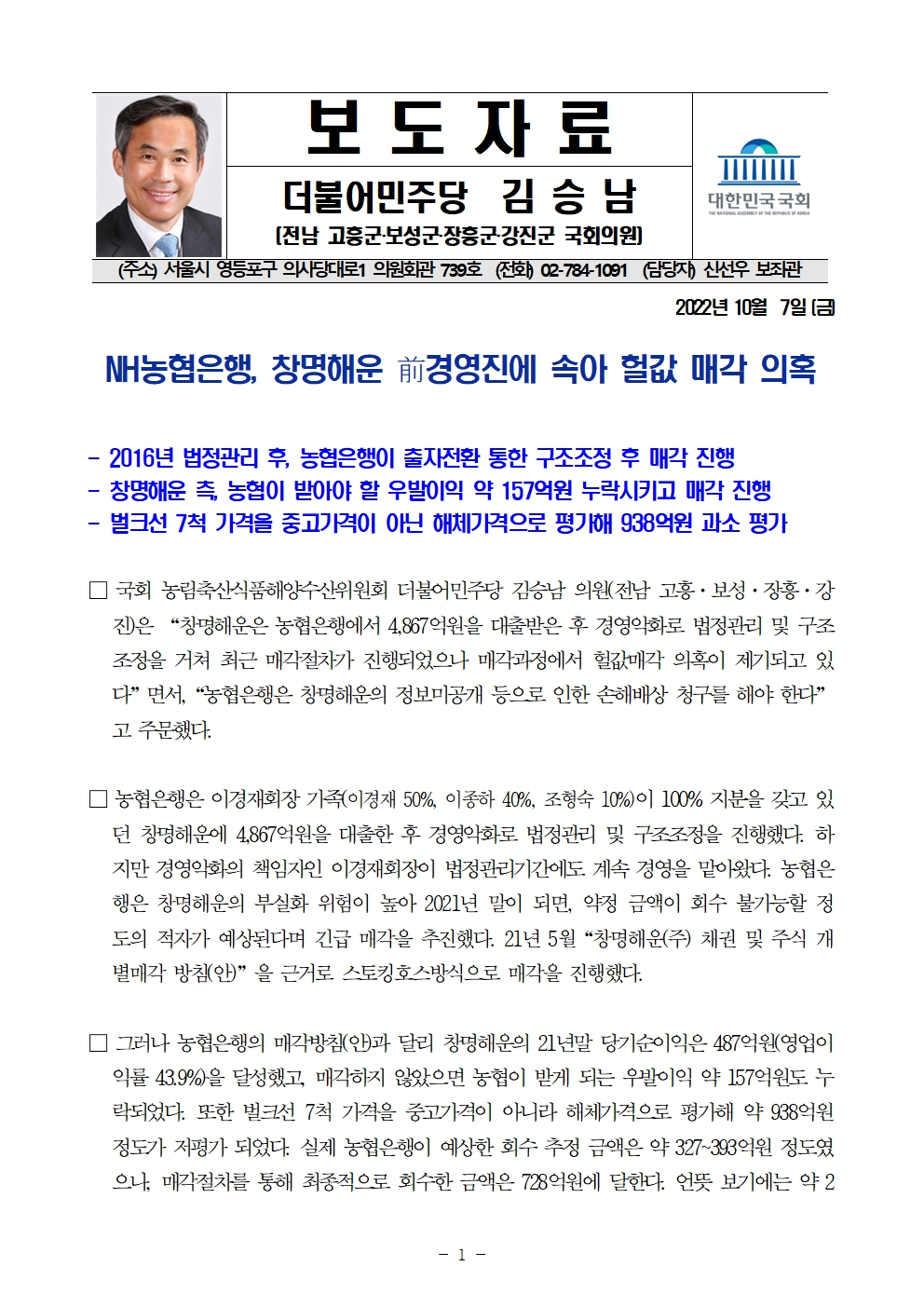 [김승남 보도자료] NH농협은행, 창명해운 (전)경영진에 속아 헐값 매각 의혹