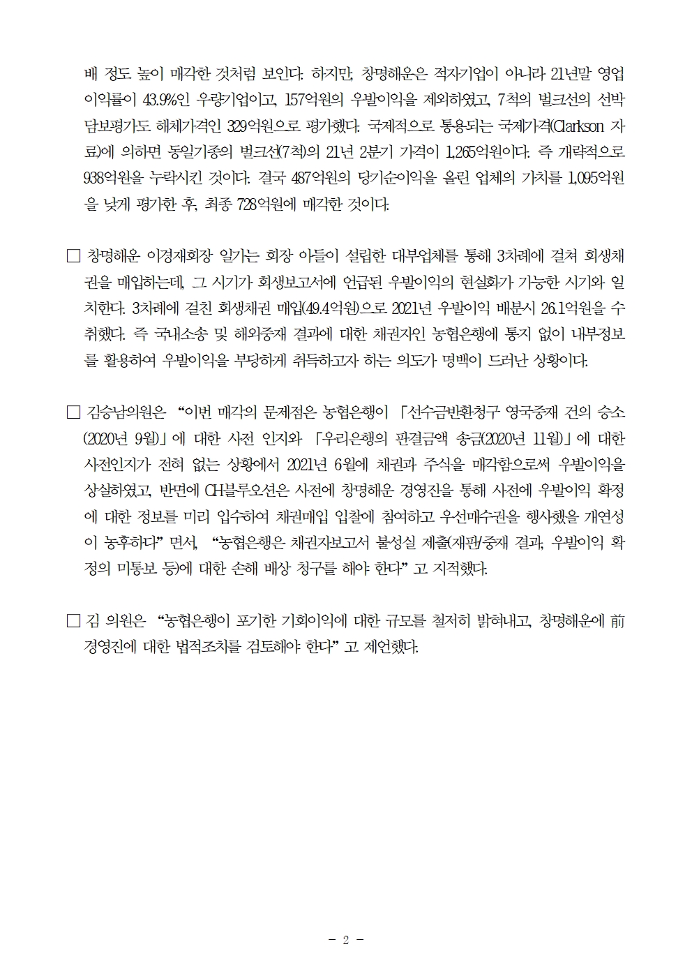 국감_보도자료_20221007_NH농협은행,_창명해운_(전)경영진에_속아_헐값_매각_의혹.hwp