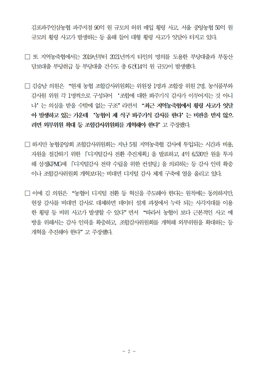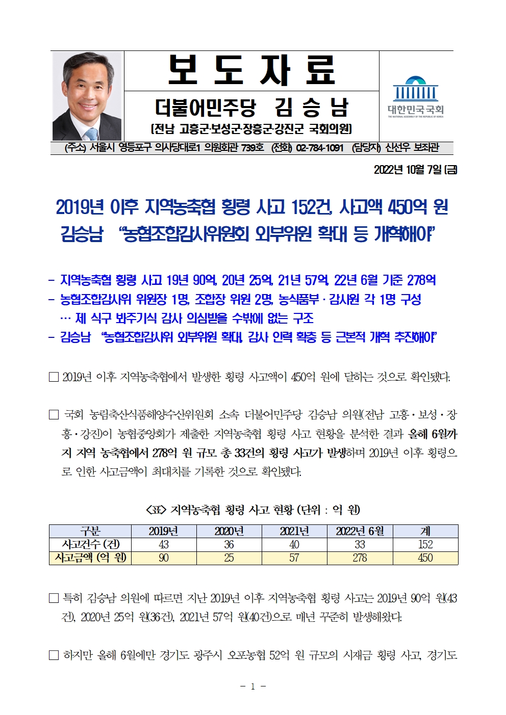 [김승남 보도자료] 농협 2019년 이후 지역농축협 횡령사고 152건, 사고액 450억 원
