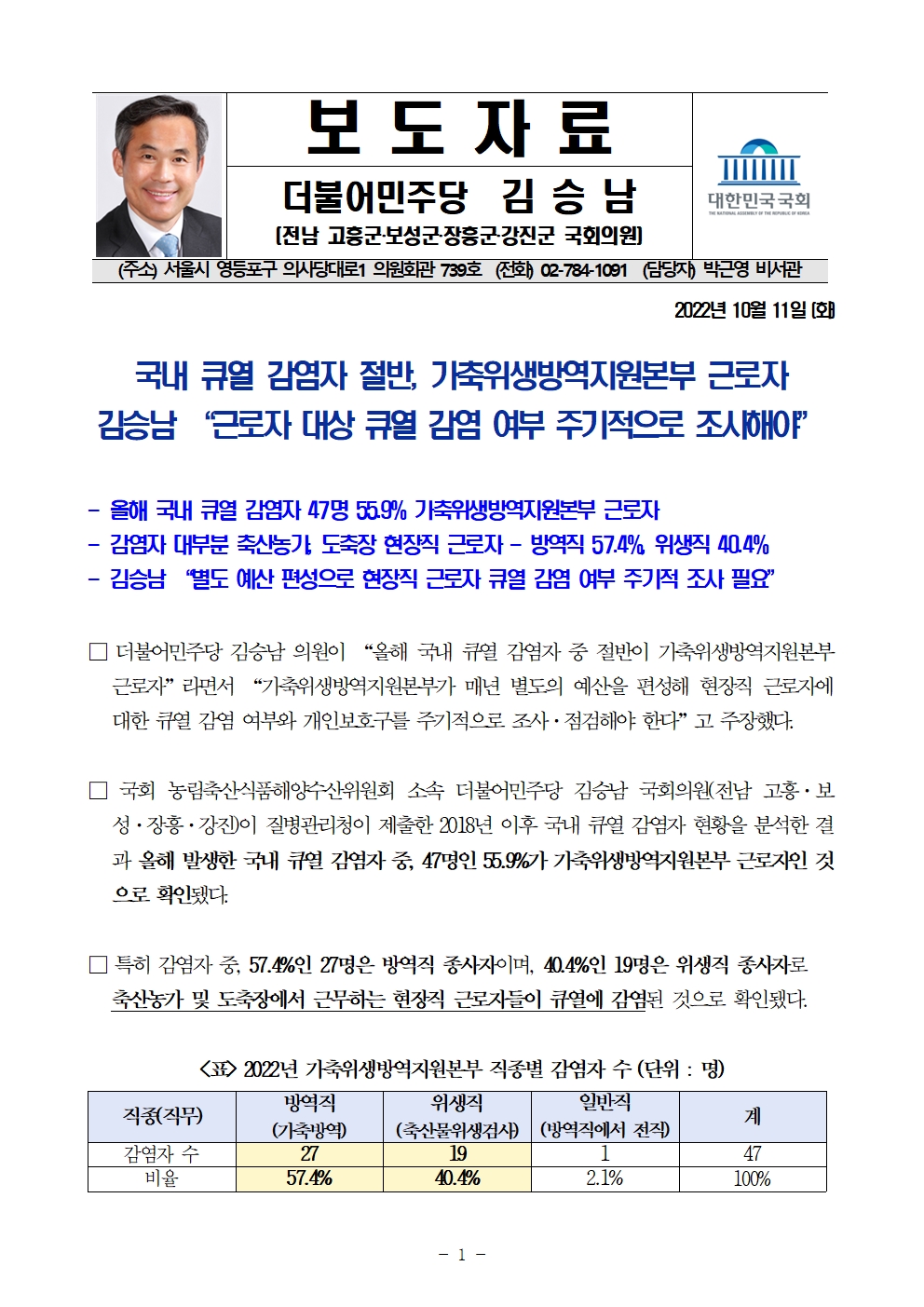 국감_보도자료_20221011_보도자료_김승남_의원_국내_큐열_감염자_절반_가축위생방역지원본부_근로자.hwp