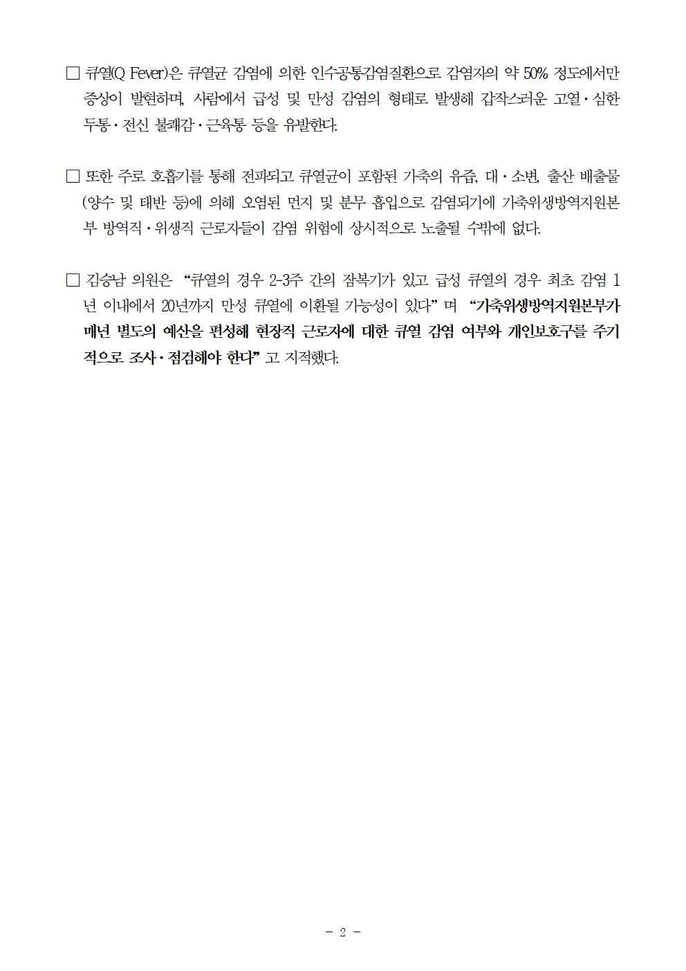[김승남 보도자료] 국내 큐열 감염자 절반 가축위생방역지원본부 근로자