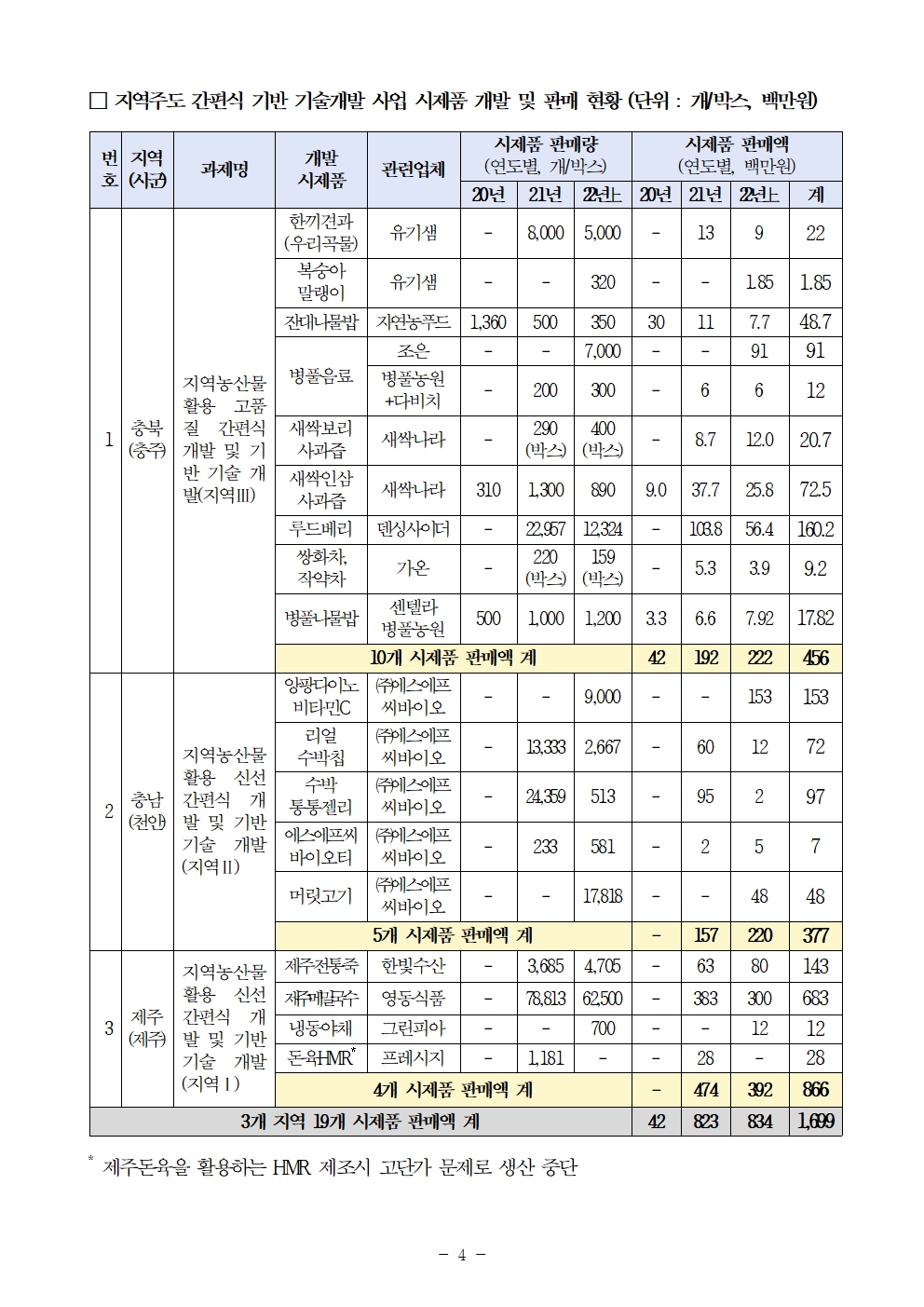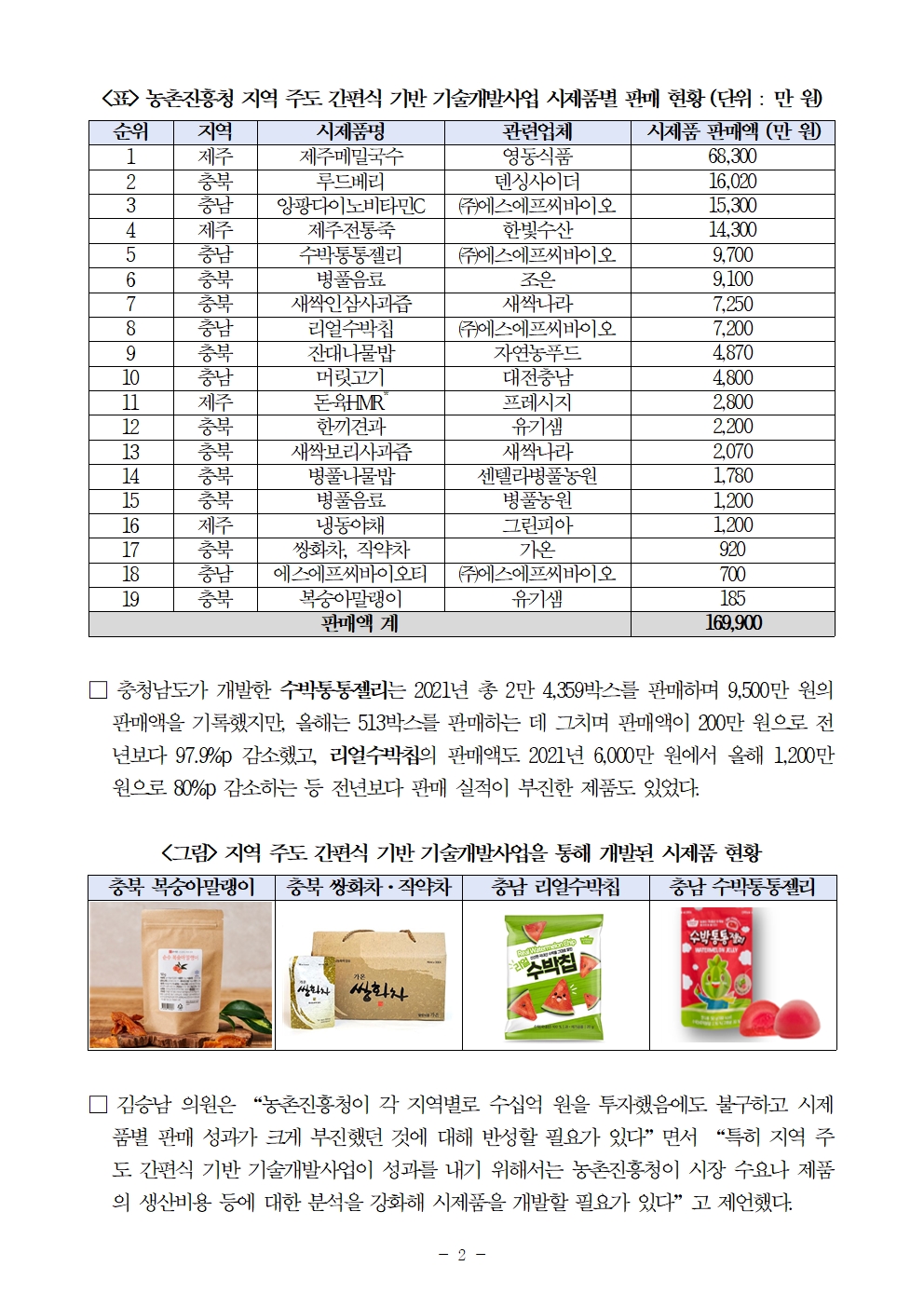 [김승남 보도자료] 농진청 지역 주도 간편식 기반 기술개발사업 시제품 판매액 3년째 약 17억 원에 불과