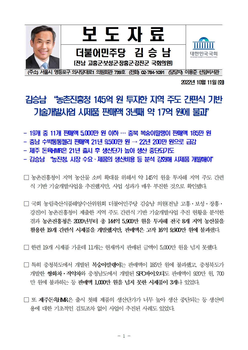 국감_보도자료_20221011_보도자료_김승남_의원_농진청_지역_주도_간편식_기반_기술개발사업_시제품_판매액_3년째_약_17억_원에_불과.hwp