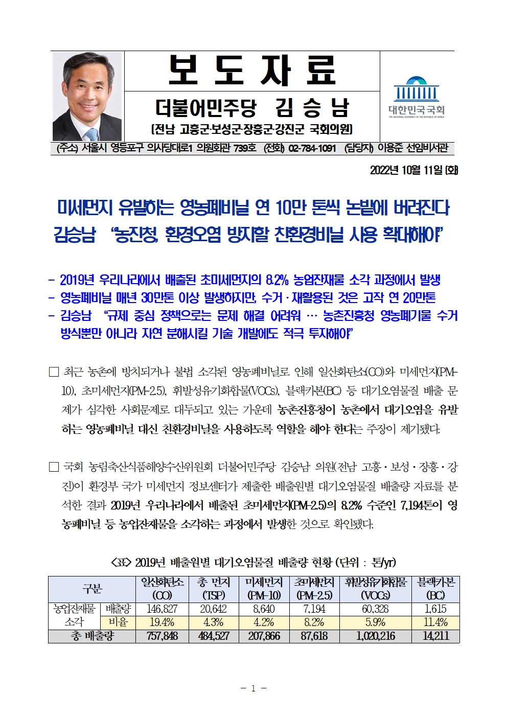국감_보도자료_20221011_보도자료_김승남_의원_매년_논밭에_버려지는_영농폐비닐_10만_톤.hwp